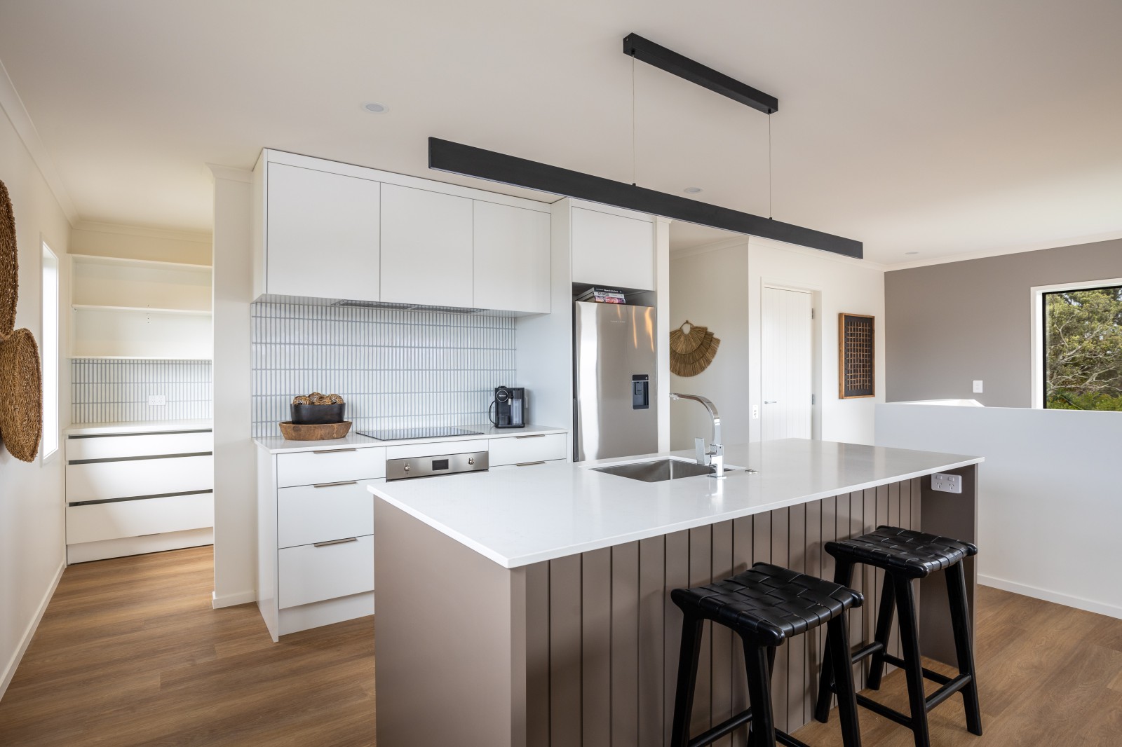 The open plan living area is bathed in natural light and showcases a stunning kitchen with a butler's pantry and tiled splash back. Step out onto the private deck and be captivated by the sea vistas, offering the perfect spot to relax and unwind.