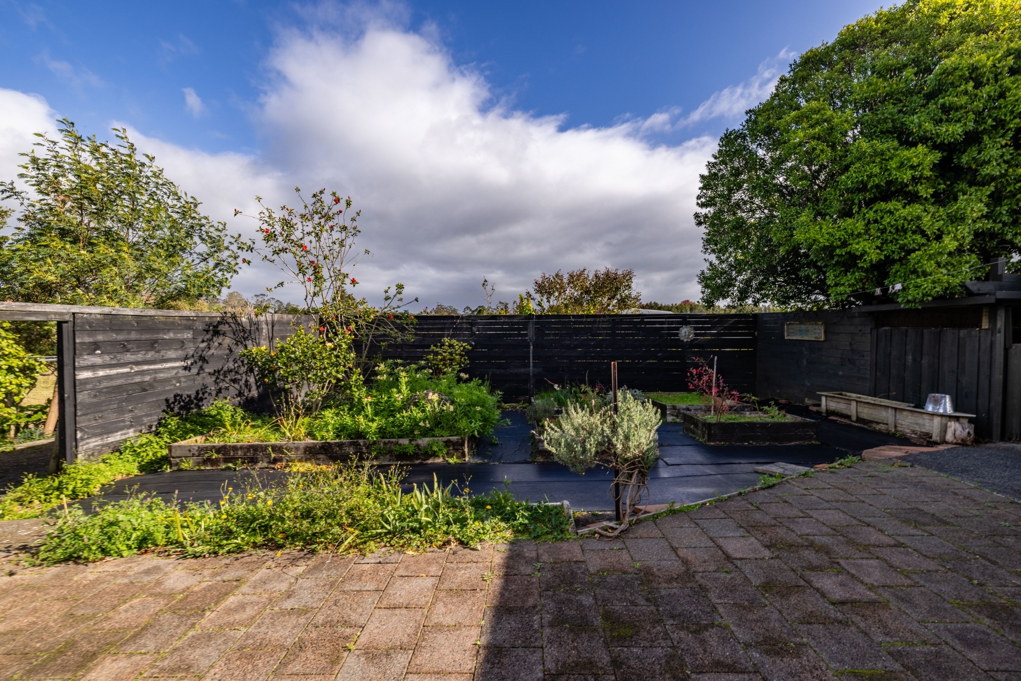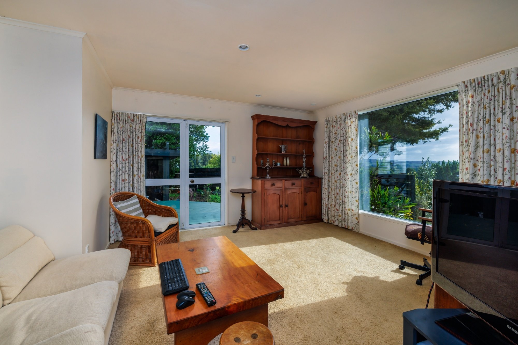 there is a standard kitchen with attached dining overlooking an enclosed raised garden area perfect for all those fresh home-grown vegetables. The large lounge/ TV room opens onto a great wrap around covered deck area great for those outdoor al fresco dinning events while watching the stunning sunsets in the west. surrounded by mature trees affording shelter and privacy (there is a local Tui who has claimed a mature hibiscus as his own)