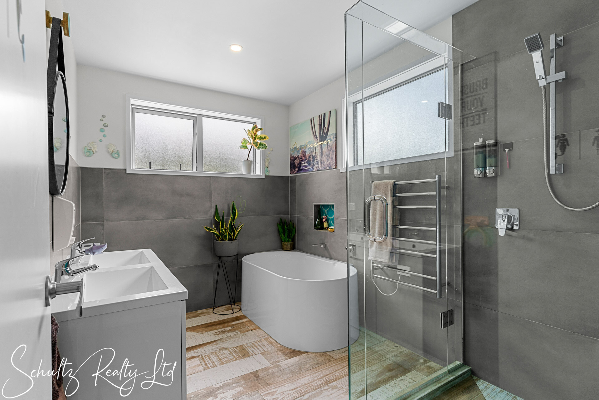 The first bedroom is generously sized, featuring a large double wardrobe, built-in shelves, and outdoor access. The second bedroom shares this spaciousness and charm. The light-filled master suite includes an ensuite and generous wardrobe space. The main bathroom features a double vanity, freestanding bath, separate shower, and toilet. A functional separate laundry provides ample storage, complemented by extra space in the attic.