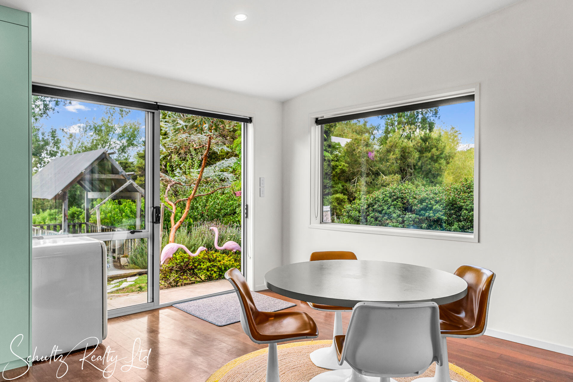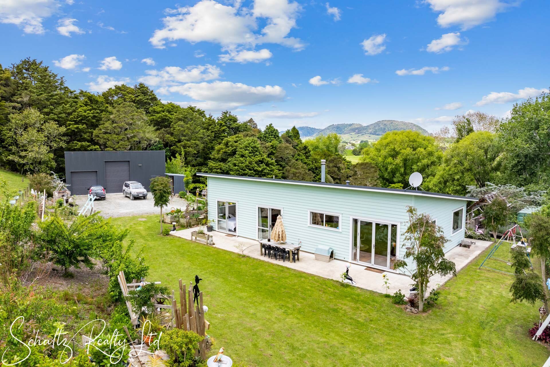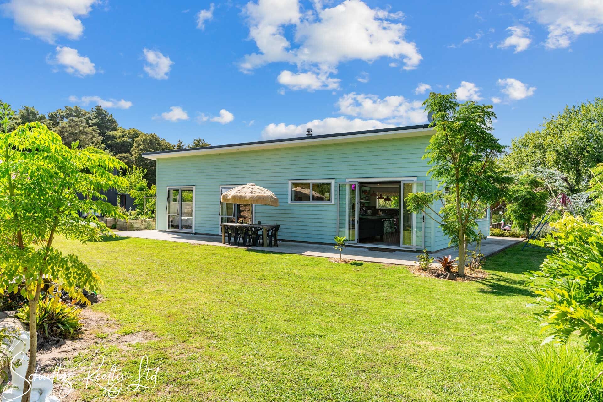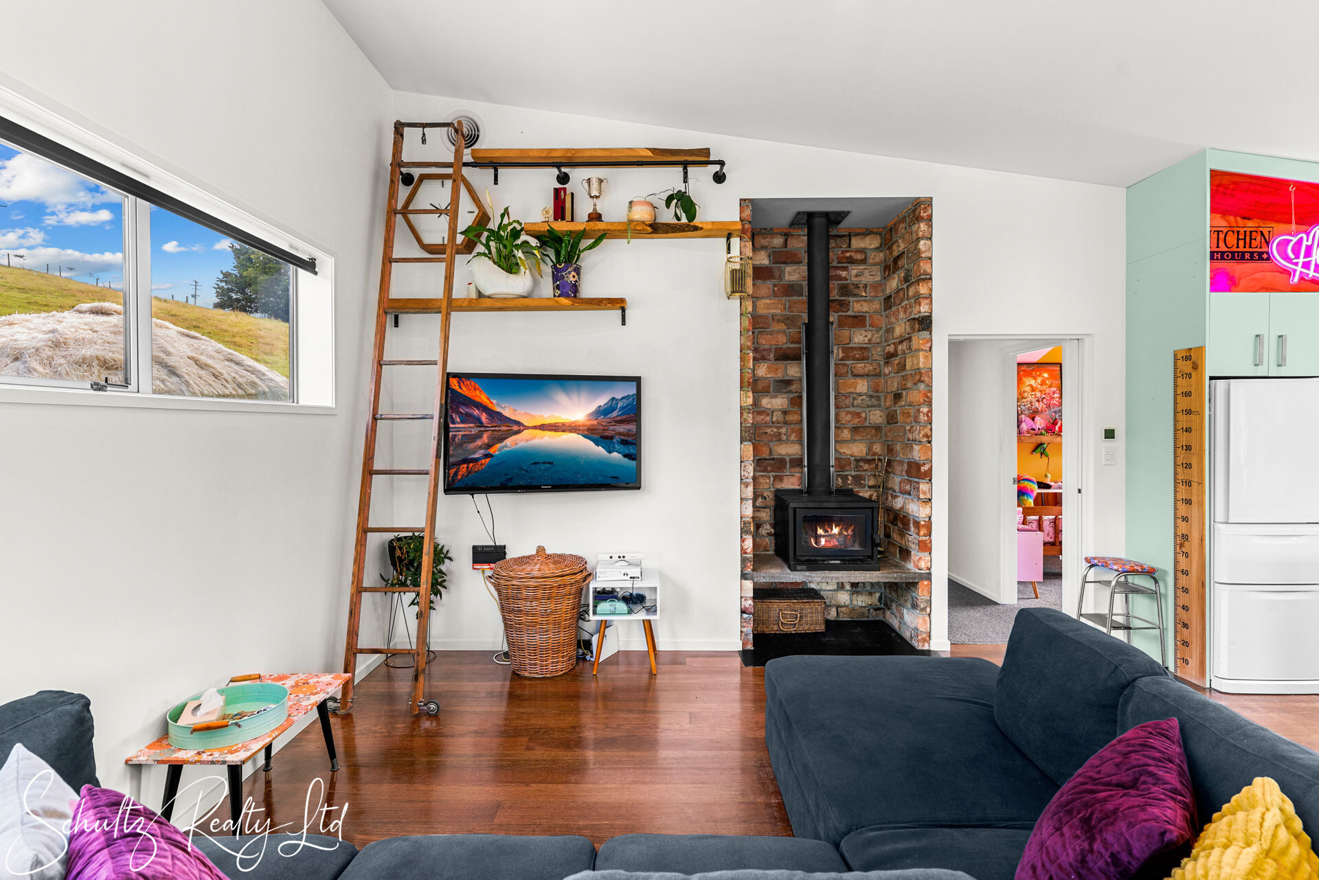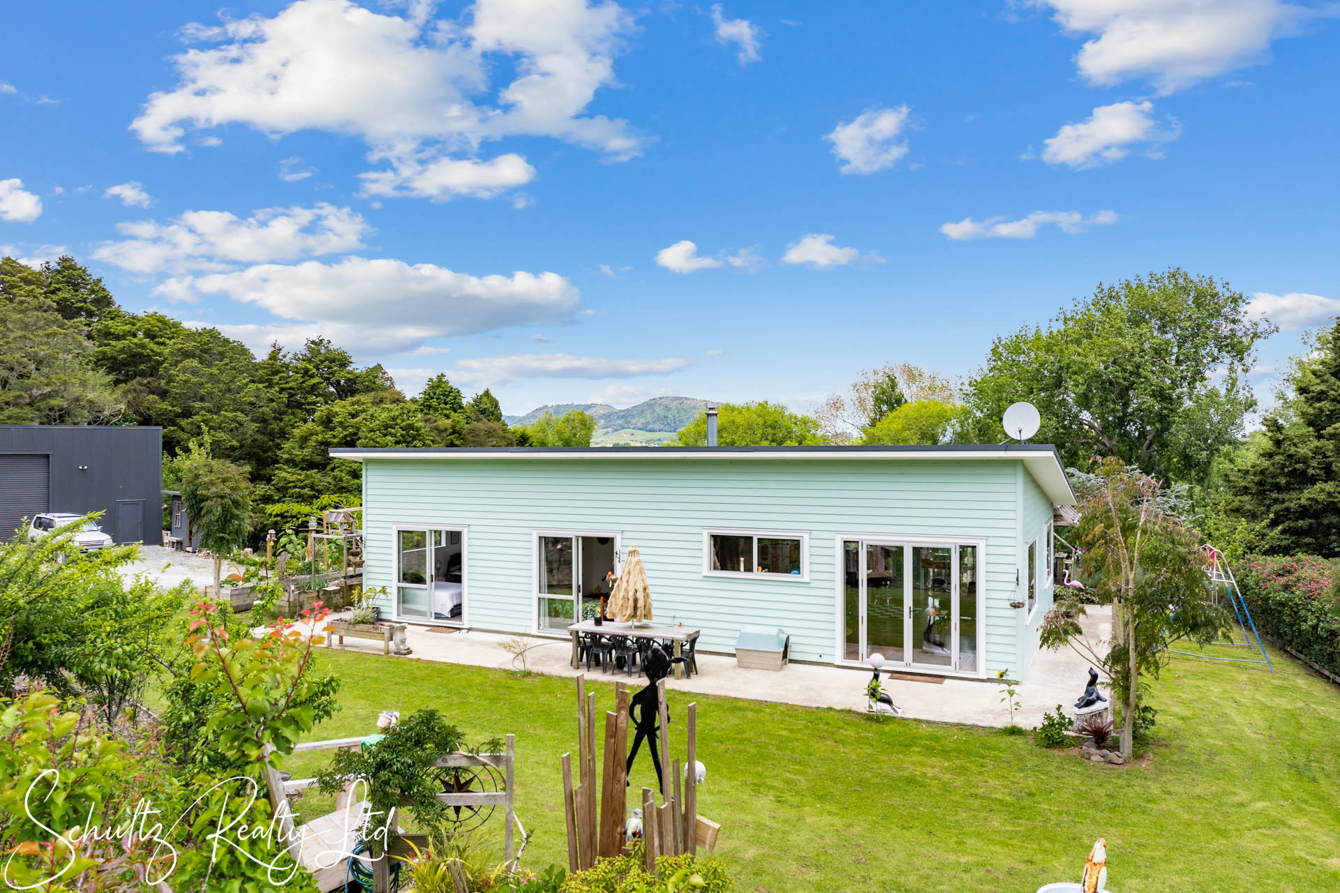 Be greeted by a charming mint-coloured home that beckons you inside. The landscaped yard enhances the property's appeal, while the open-plan living space steals the show. Step into the 50s diner-inspired kitchen, complete with Kwila hardwood floors, abundant natural light, and ranch sliders leading to an outdoor dining area with breathtaking rural views. While the kitchen offers unique charm, it also provides the opportunity to redesign and make it your own, tailoring it to suit your personal style and needs. Inside, a wood burner, heat transfer system, full insulation, and double-glazed aluminum joinery ensure year-round comfort.