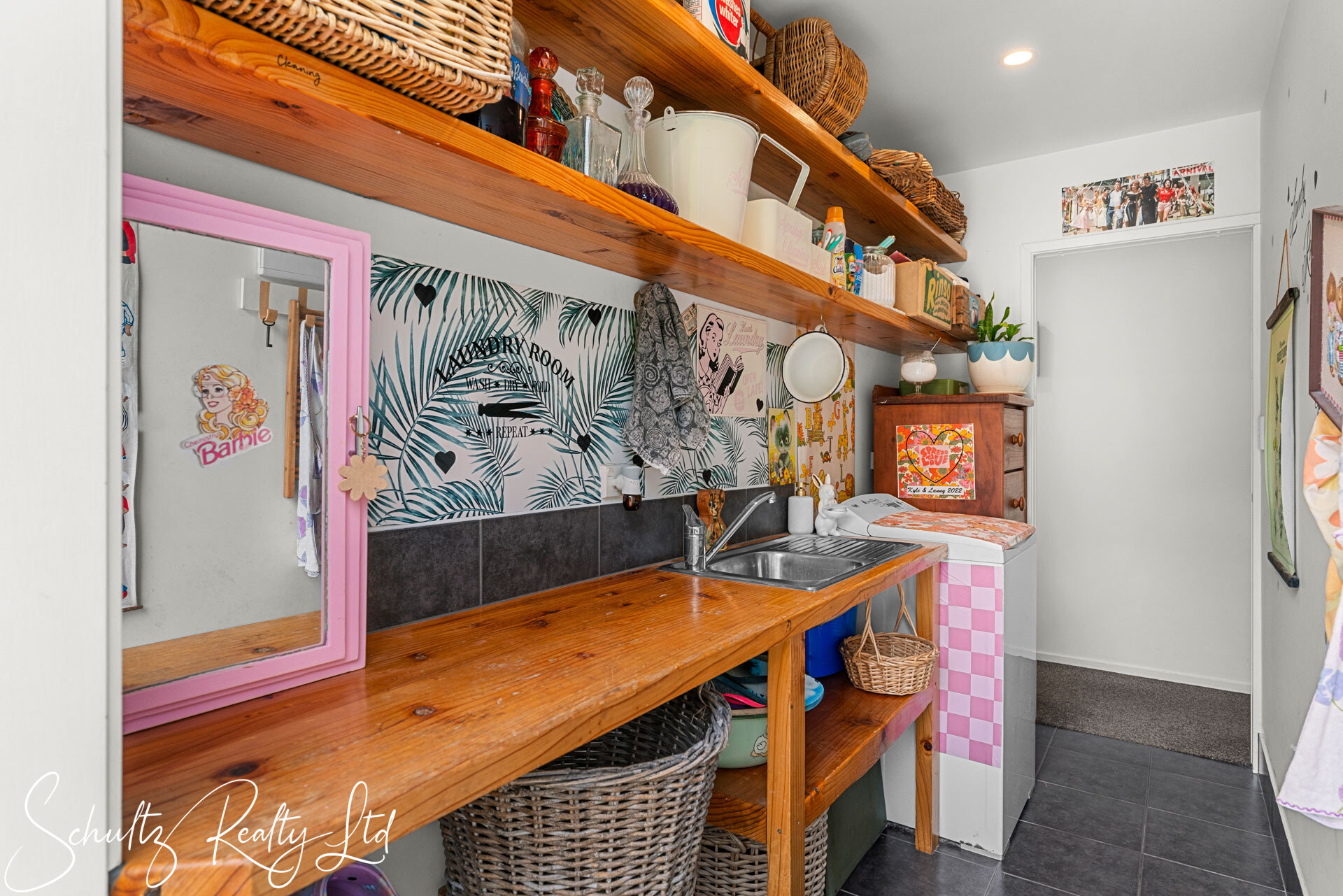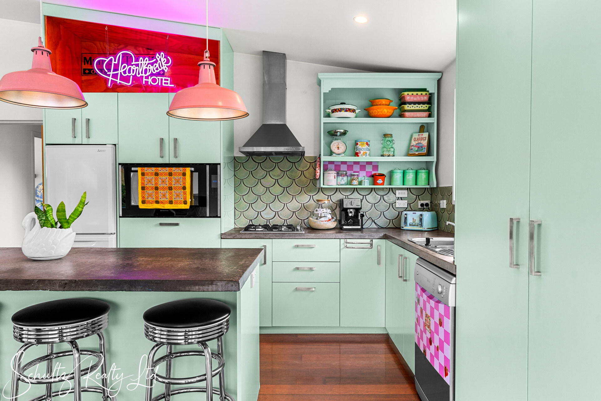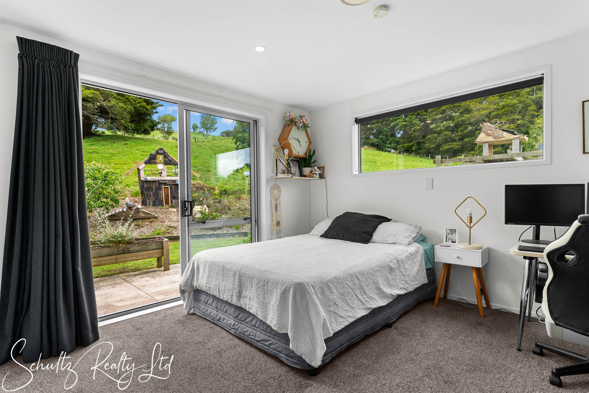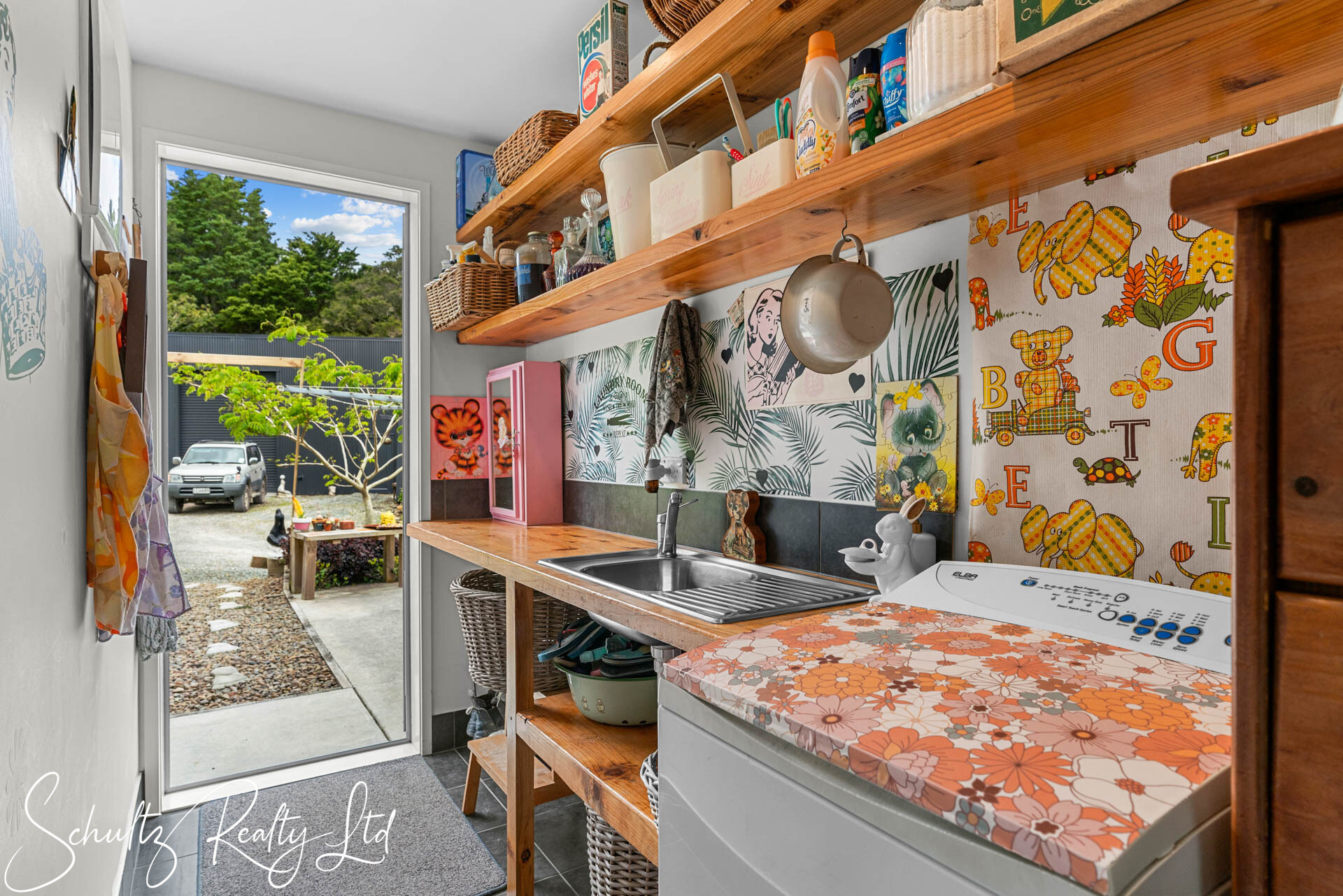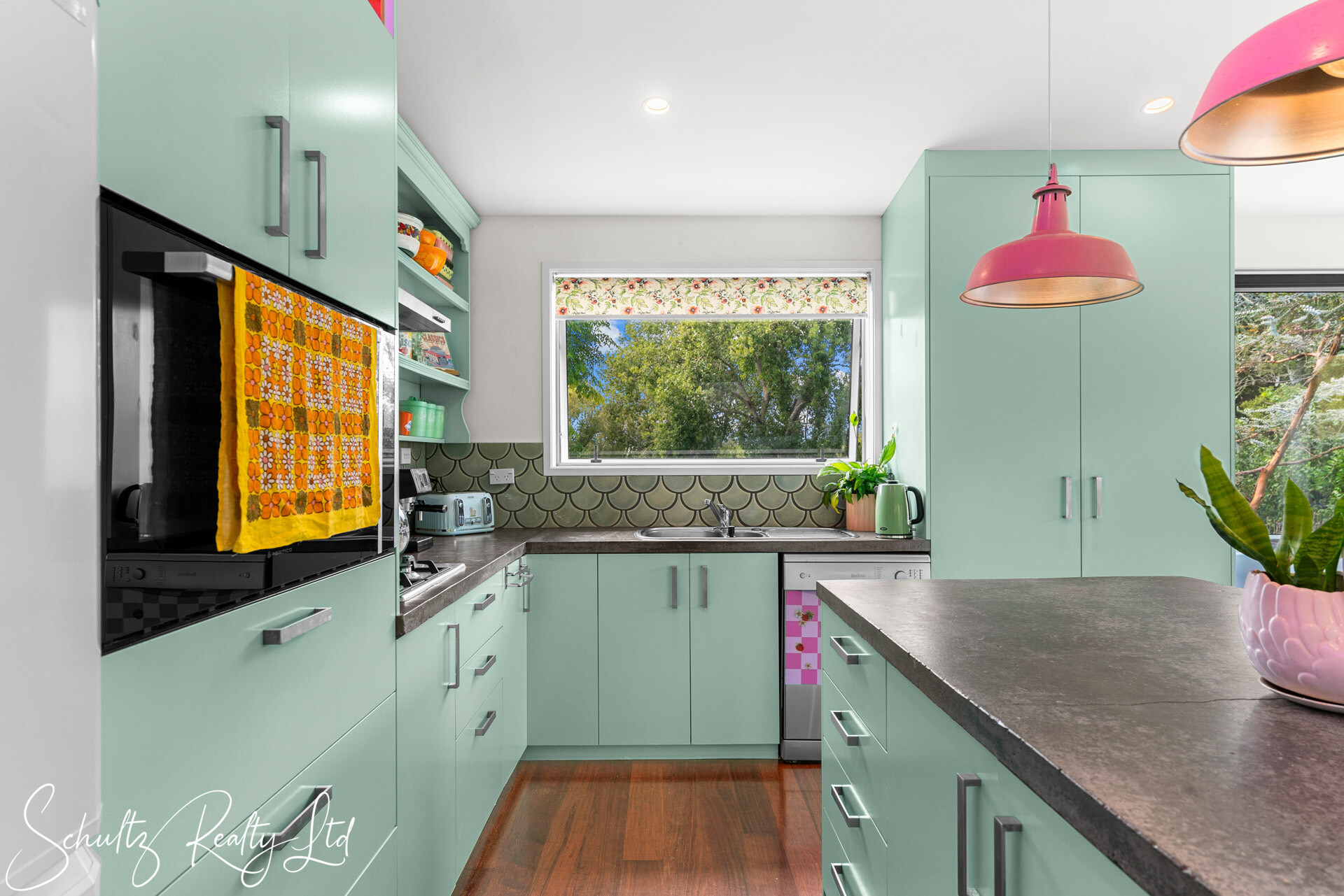 Be greeted by a charming mint-coloured home that beckons you inside. The landscaped yard enhances the property's appeal, while the open-plan living space steals the show. Step into the 50s diner-inspired kitchen, complete with Kwila hardwood floors, abundant natural light, and ranch sliders leading to an outdoor dining area with breathtaking rural views. While the kitchen offers unique charm, it also provides the opportunity to redesign and make it your own, tailoring it to suit your personal style and needs. Inside, a wood burner, heat transfer system, full insulation, and double-glazed aluminum joinery ensure year-round comfort.
