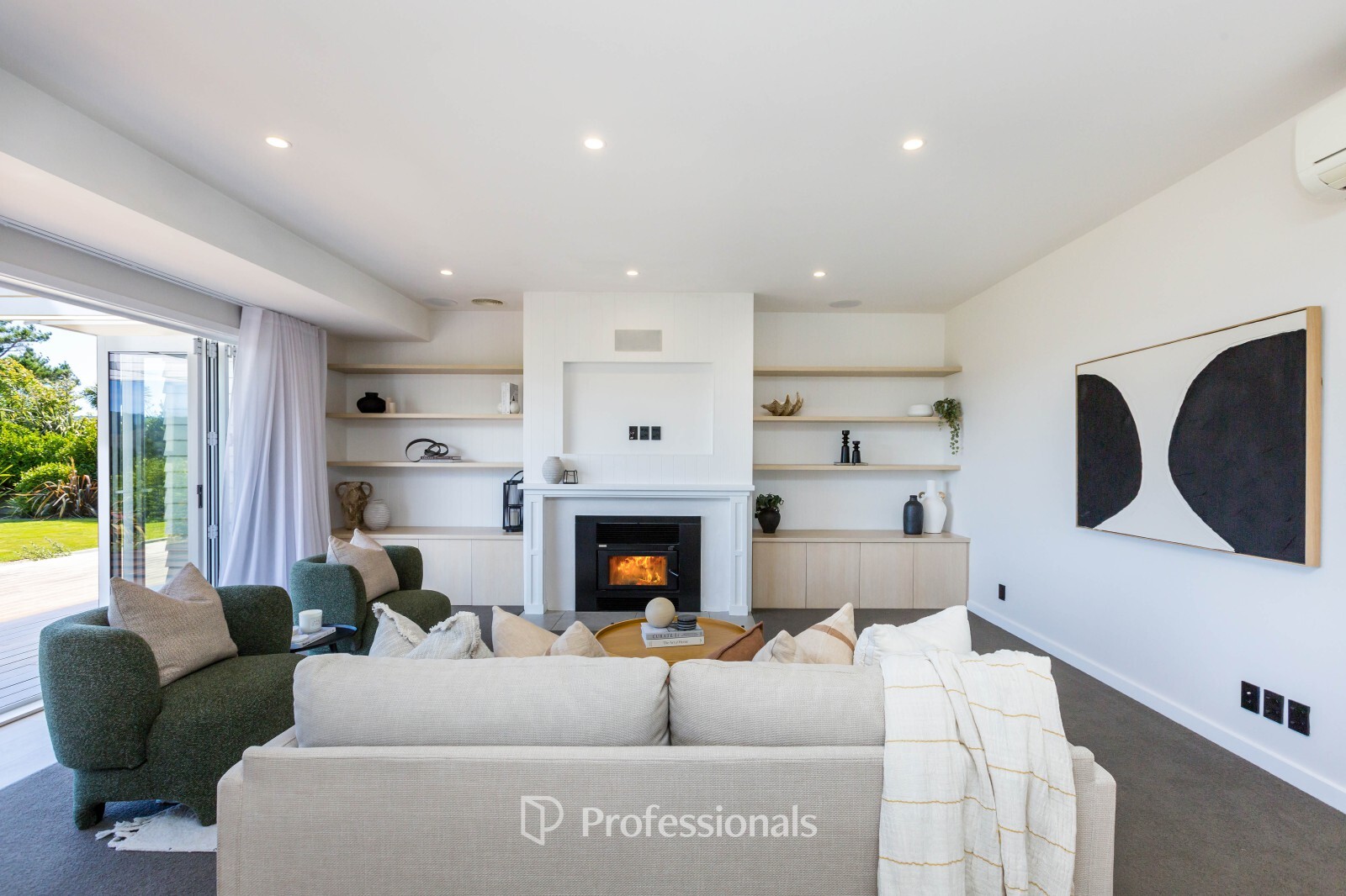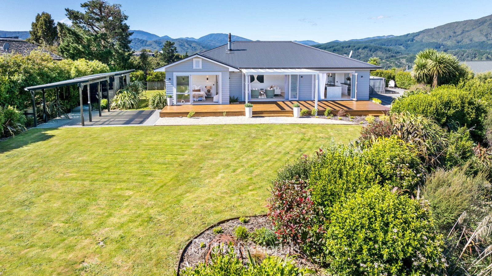 Comfort and convenience are built in throughout the home with a ducted heating and cooling system, wood burner, built-in speakers inside and out, and quality window dressings throughout.