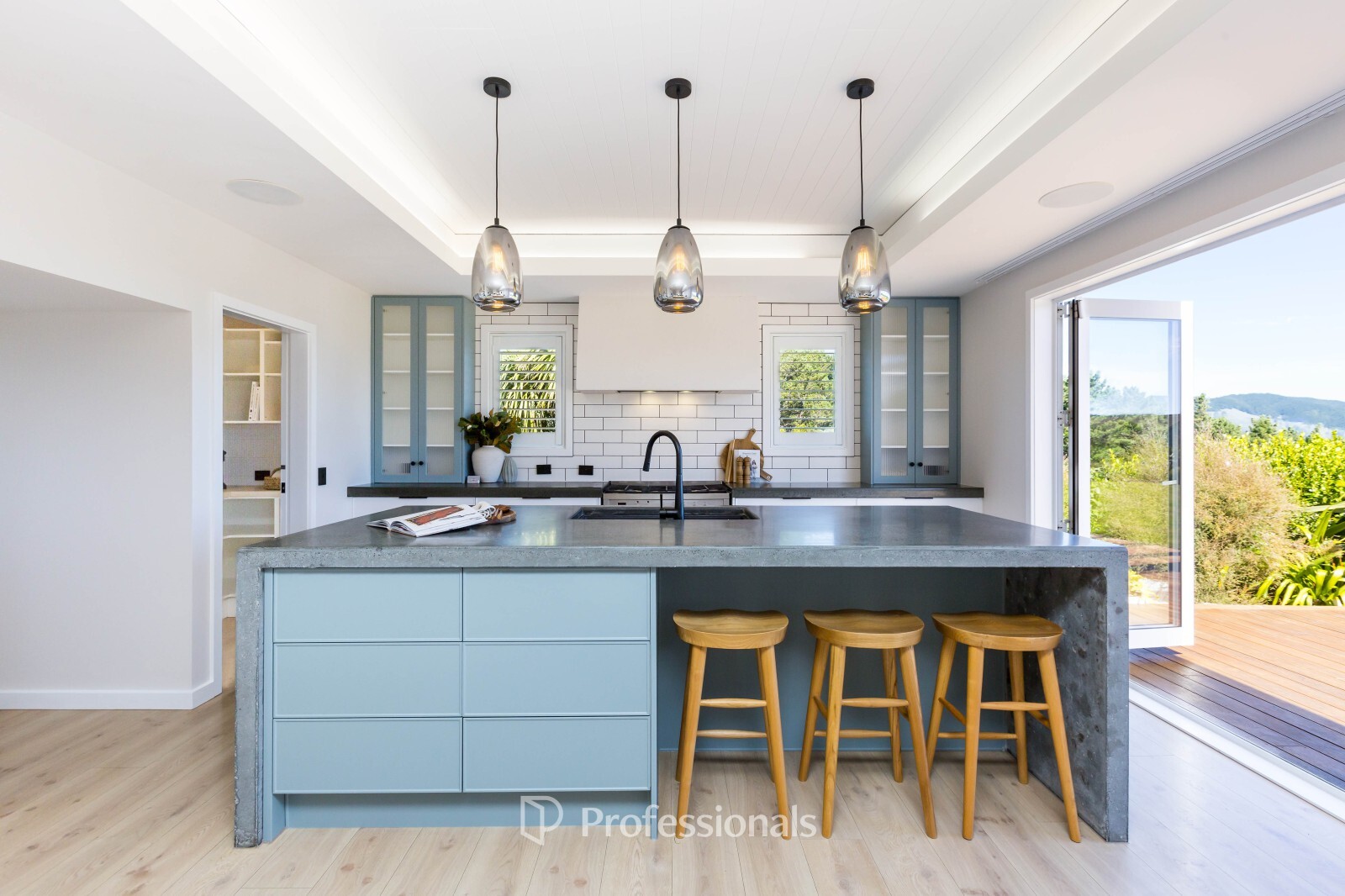 At the centre of the home sits a beautifully remodelled kitchen with scullery, connecting with an open plan living space. Large windows and doors provide seamless indoor/outdoor flow when open and brilliantly frame the views when closed.