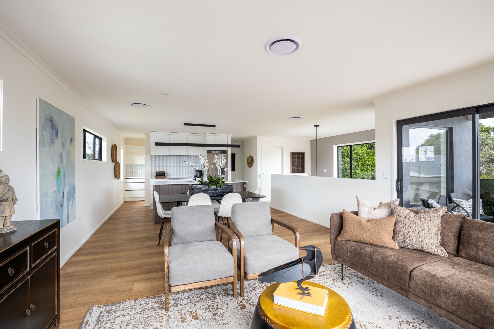 The open plan living area is bathed in natural light and showcases a stunning kitchen with a butler's pantry and tiled splash back. Step out onto the private deck and be captivated by the sea vistas, offering the perfect spot to relax and unwind.