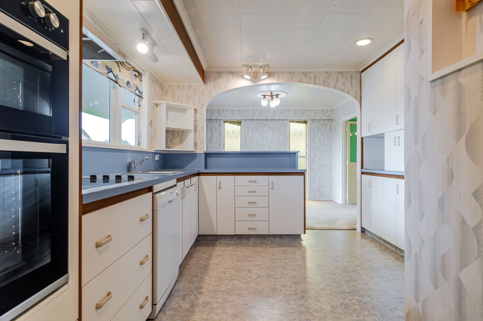 Step inside and be greeted by a bright and spacious living room that flows into the dining and kitchen area. French doors open wide to a private covered deck, the perfect spot for entertaining or soaking up the afternoon sun. The bathroom may be original, but its clever design stands out: a separate toilet and vanity, a separate shower and a separate bath with its own vanity, practical and ahead of its time. Three bedrooms are smartly separated from the living area, giving everyone their own space.