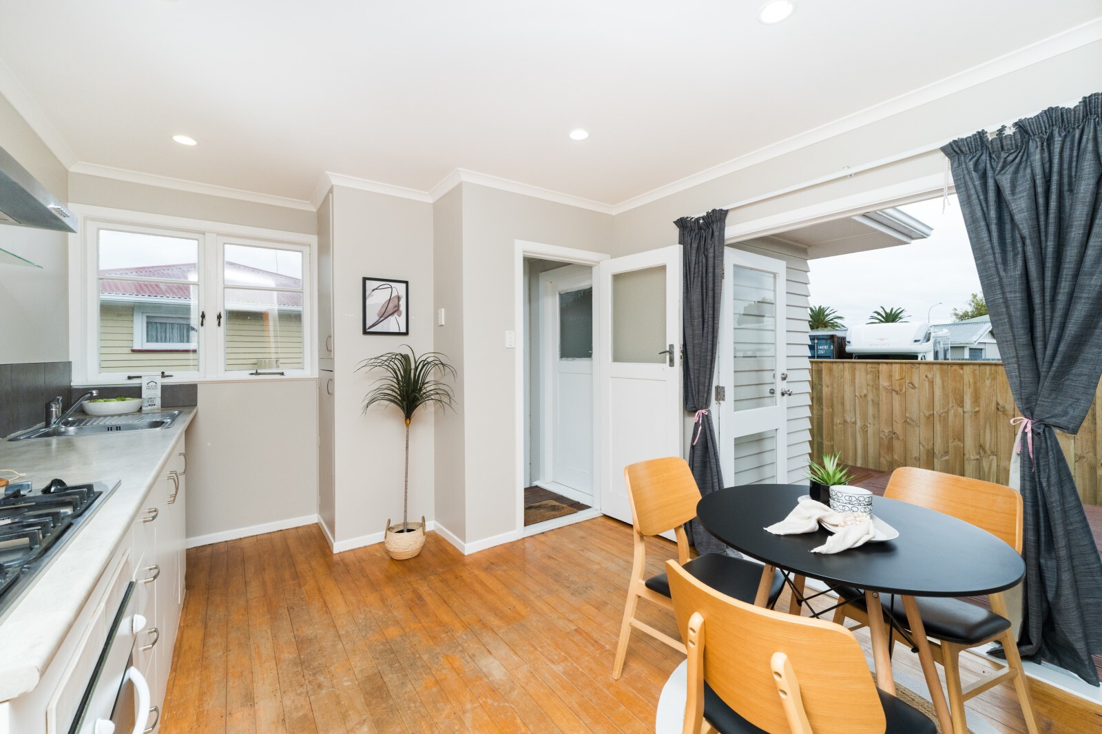 At the heart of the home, the open plan kitchen and dining creates a natural hub for family life—perfect for busy planning sessions over breakfast or evening debriefs while dinner is cooking. French doors open out to the rear deck, extending your living space outdoors—ideal for summer BBQs, a morning coffee, or an easy-care spot to unwind without the burden of a large section.
