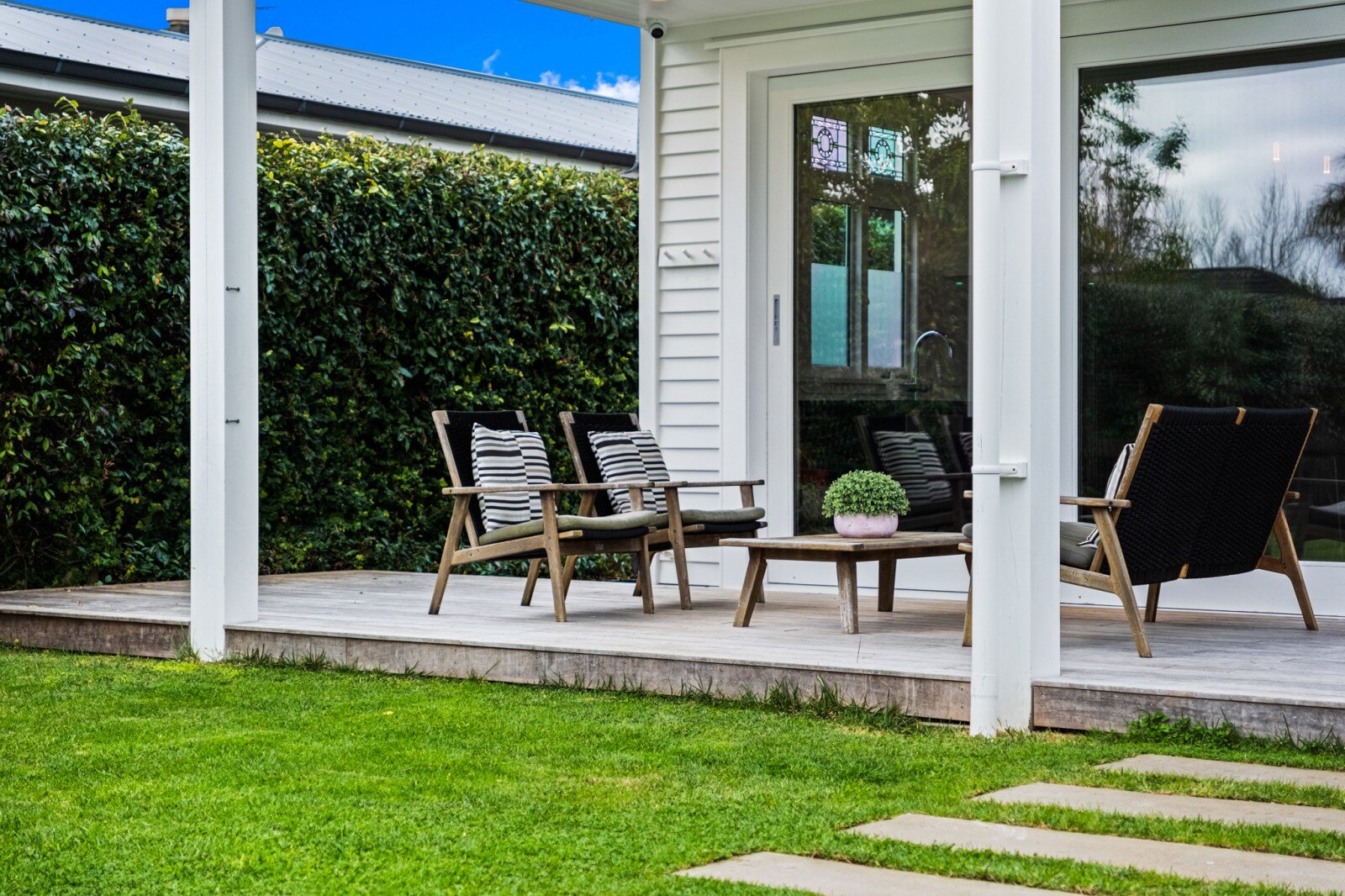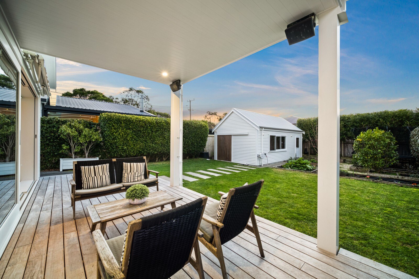 The freestanding studio is a fantastic addition, offering flexible space that can be used as an office, guest accommodation, or creative studio.