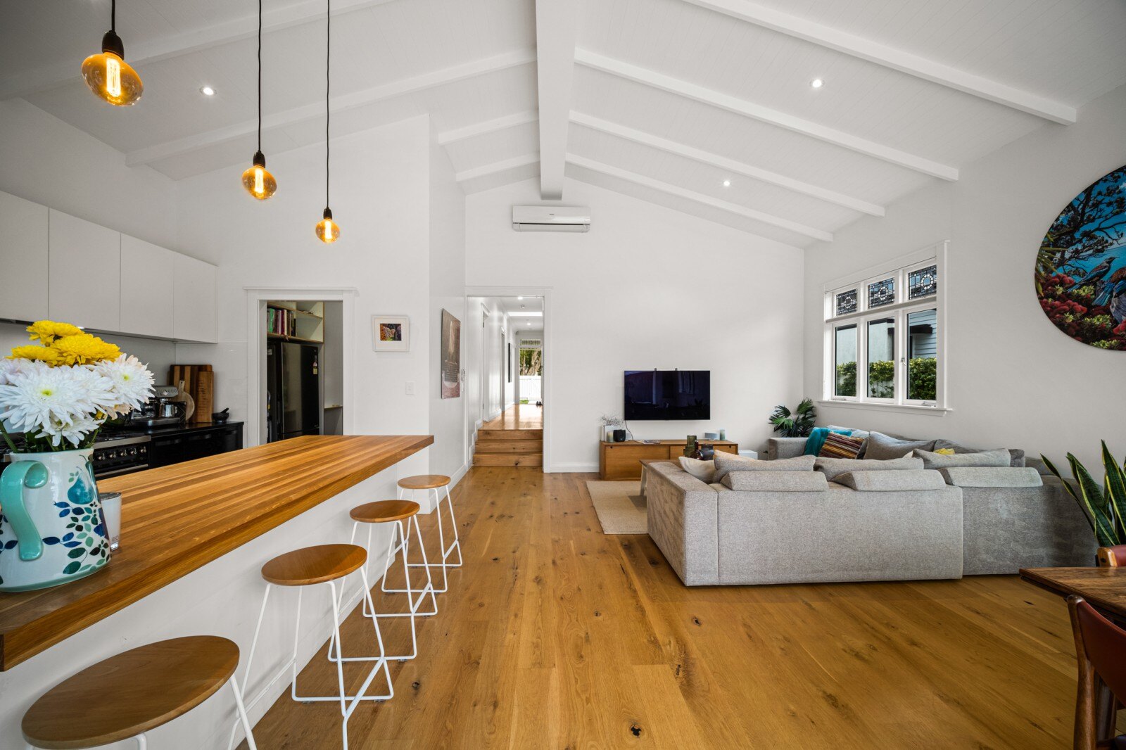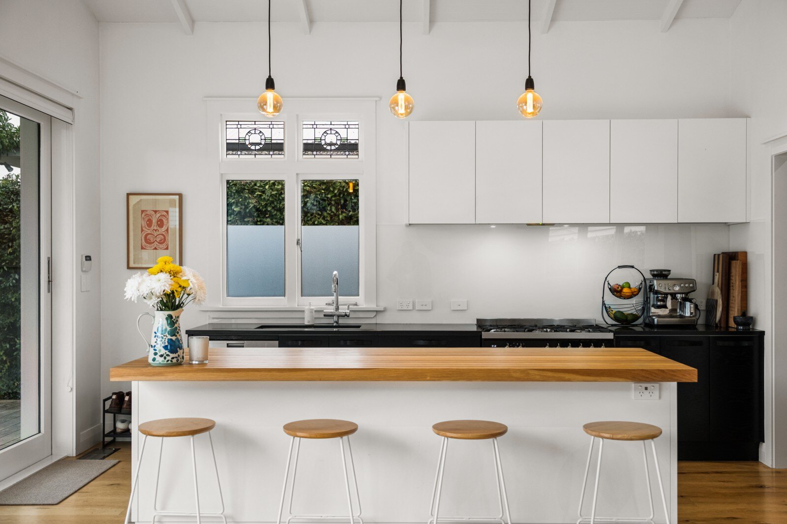 The home boasts four spacious bedrooms, each with built-in wardrobes and ceiling fans for comfort during the summer months. Bespoke leadlight windows add a touch of elegance throughout. The modern open-plan kitchen, with a convenient scullery is perfect for both family living and entertaining. The lounge, featuring a high vaulted ceiling and four expansive north-facing windows, offers a bright and airy living space bathed in natural light, extending seamlessly to a level back section ending with raised garden beds.