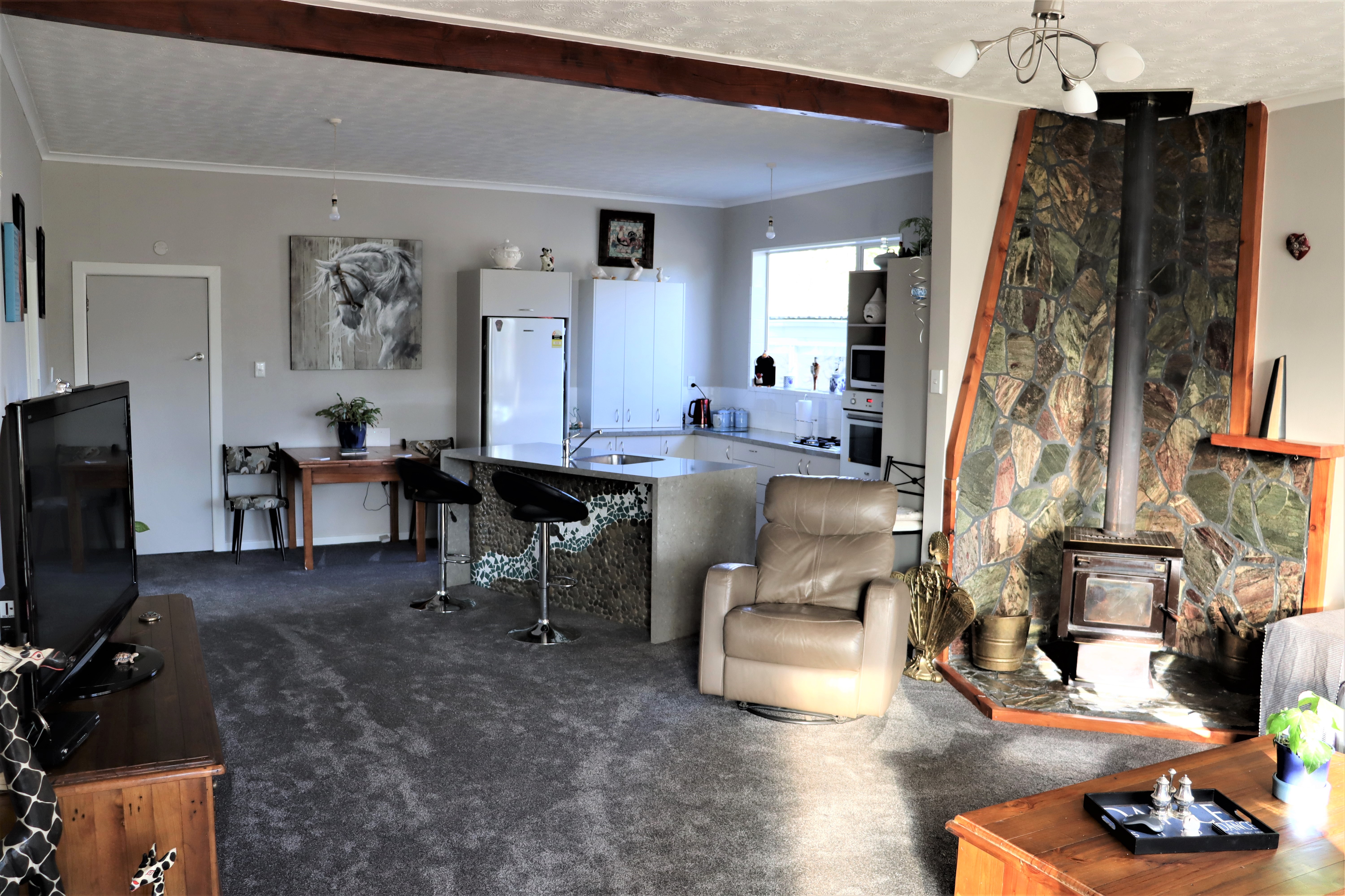 Here is a beautiful example of how an older home has kept it's character, had personal touches added and still moved with the times. Including gas hot water, new carpet, fantastic storage, freshly painted exterior and interior. Generous open plan living area is heated by a freestanding logburner, with an artistic stone surround. A stunning compliment to this, is the island bar with handcrafted, mosaic and stone river scene on the front. Master bedroom has built in wardrobes, cupboards and built in duchess which could be used for a desk. Bedroom two is a generous double with freestanding wardrobe and bedroom three a single with built in wardrobe and shelving. Spacious, modern bathroom and laundry are tastefully combined with a wet floor shower, deep iron bath, and vanity. This lovely home is designed to make you relax, starting with breakfast in the spacious and modern east facing sunroom. Then as the day draws to a close, move to the generous west facing sunroom that has space to be another living area. This leads out to the large deck that currently has a spa pool and seating. There is a tandem garage, workshop, pump shed with pump, glasshouse, and easycare garden beds. Located in the Waitaki Bridge Village, approx 2.3kms to Glenavy and approx 20kms to Oamaru (High School bus goes past the gate). Fishing, boating right there on the Waitaki River or just enjoy being close to nature. Properties of this standard, located in rural settlements handy to town, are hard to find.