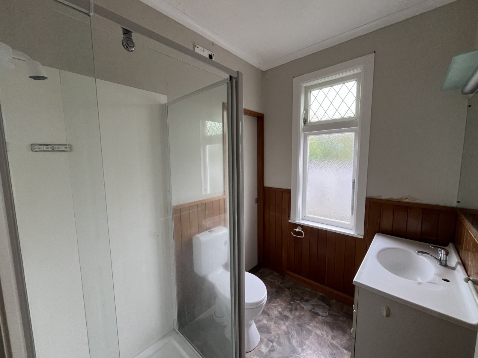 - Bathroom includes shower, toilet and vanity
