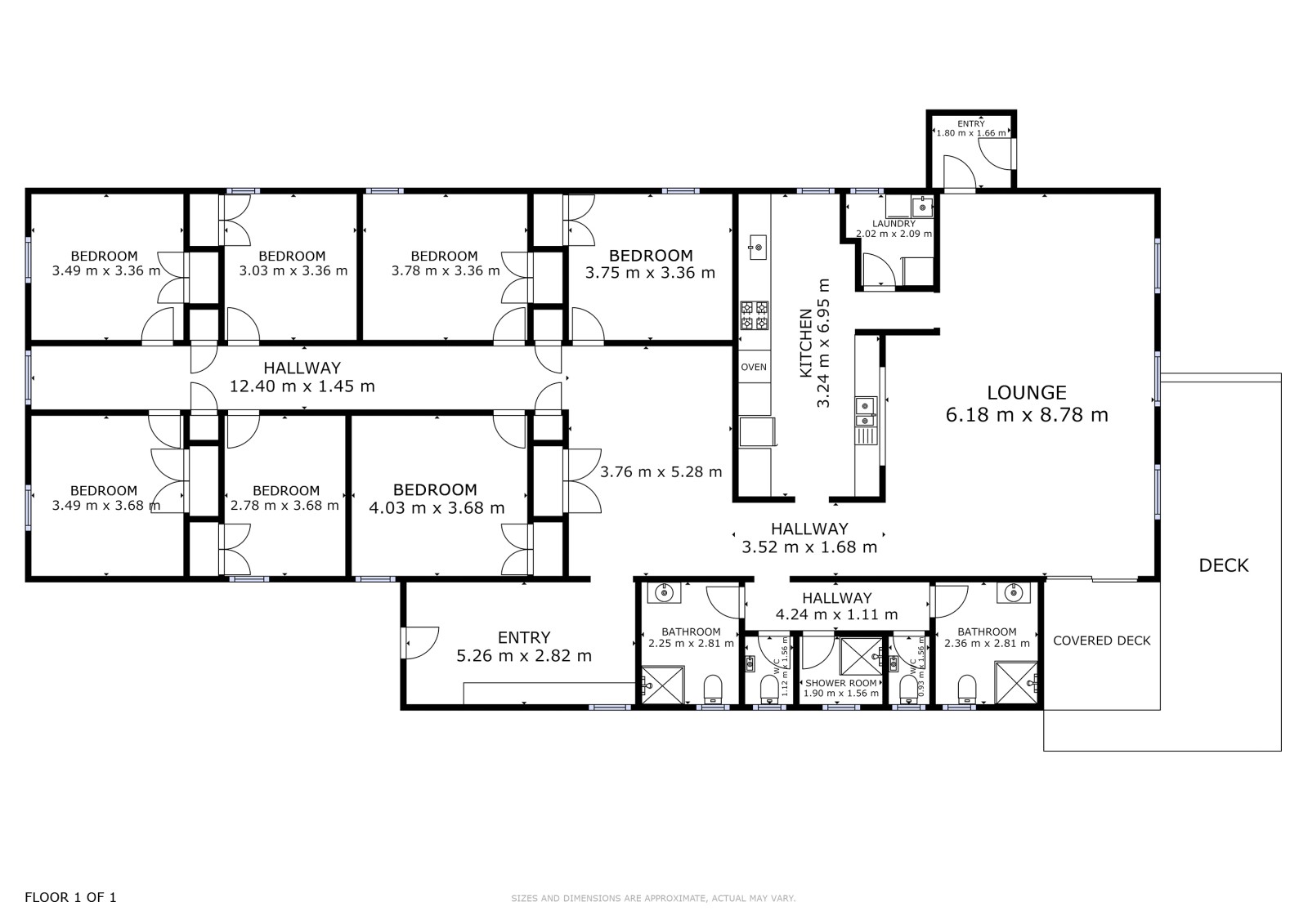 Spread across a single spacious level, the communal lounge is large and filled with natural light set atop native timber floors. The adjacent expansive kitchen is well equipped for big groups with gas cooktop, dual sinks and plenty of bench space . Doors open from the living to a vast decked area with covered and uncovered portions for easy entertaining, summer barbecues and Al fresco dining .