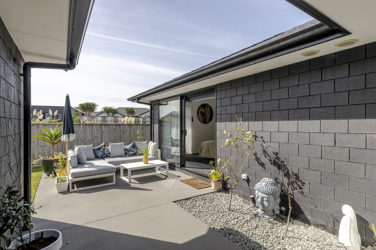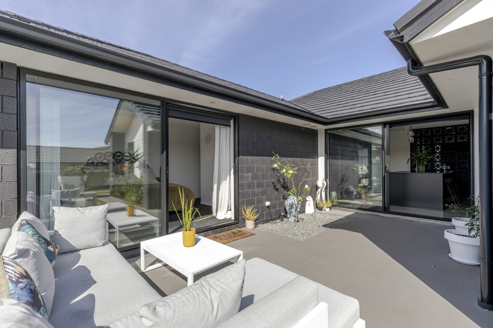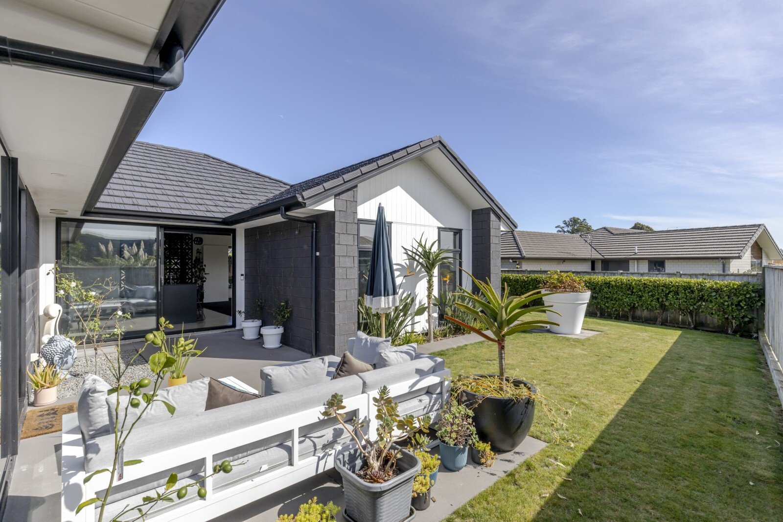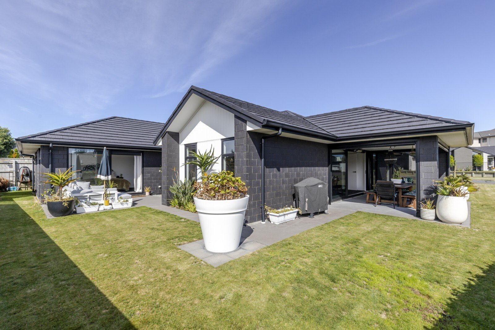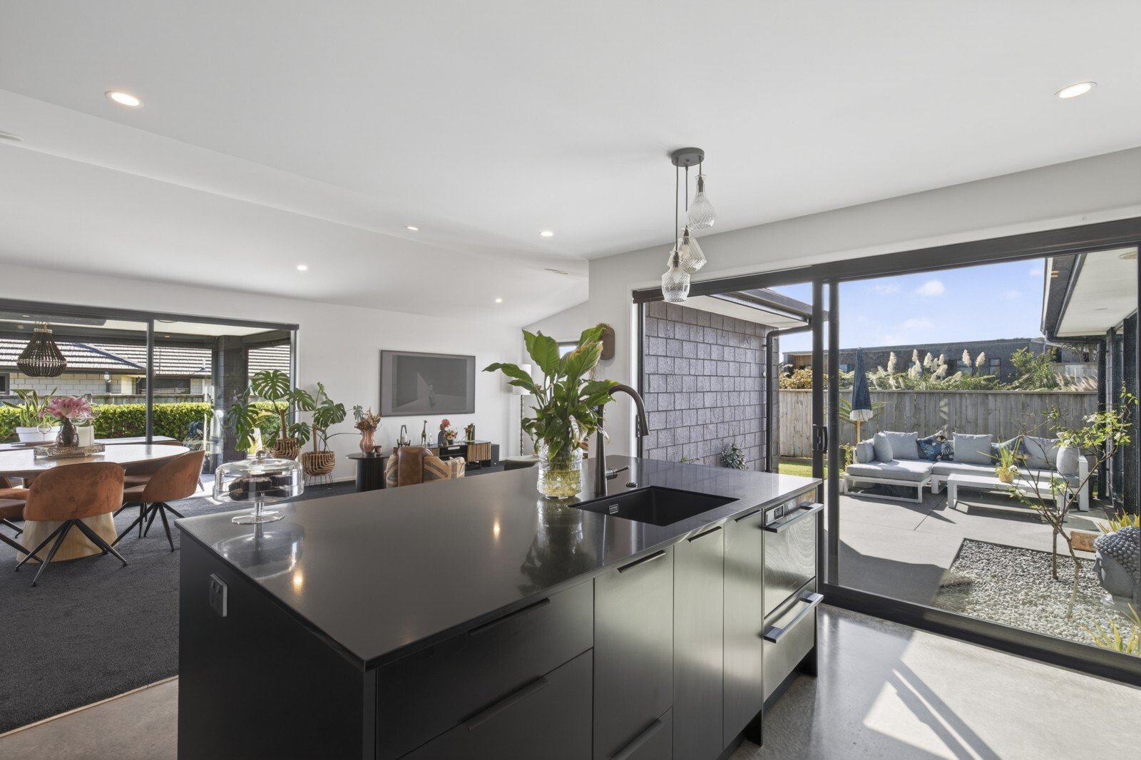 Effortless style meets comfortable living with this beautifully designed modern home. From the moment you arrive, you’ll appreciate the clean architectural lines, simple yet striking landscaping. Inside, the heart of the home unfolds into a stunning open plan kitchen, living, and dining area. This light-filled space flows effortlessly to both of the two designated outdoor living zones, creating the perfect setting for entertaining or relaxing year round. An additional separate living room offers flexibility, ideal for a media lounge, family retreat, or quiet escape. The sleek, modern kitchen is a true showpiece, complete with a breakfast bar and a well appointed scullery, combining style with functionality. The master suite is a private sanctuary, featuring a walk-in wardrobe, a beautifully finished ensuite, and direct access to one of the outdoor living spaces, perfect for enjoying your morning coffee in peace. Three additional double bedrooms provide ample space for family or guests, all serviced by a sophisticated family bathroom complete with a full-size bath. A double internal-access garage provides both convenience and security, coupled with the appeal of flat, low-maintenance grounds, perfect for those seeking a refined lifestyle without the upkeep. Set on a lovely street in the ever poplar Bell Block, with local amenities and primary school close by.