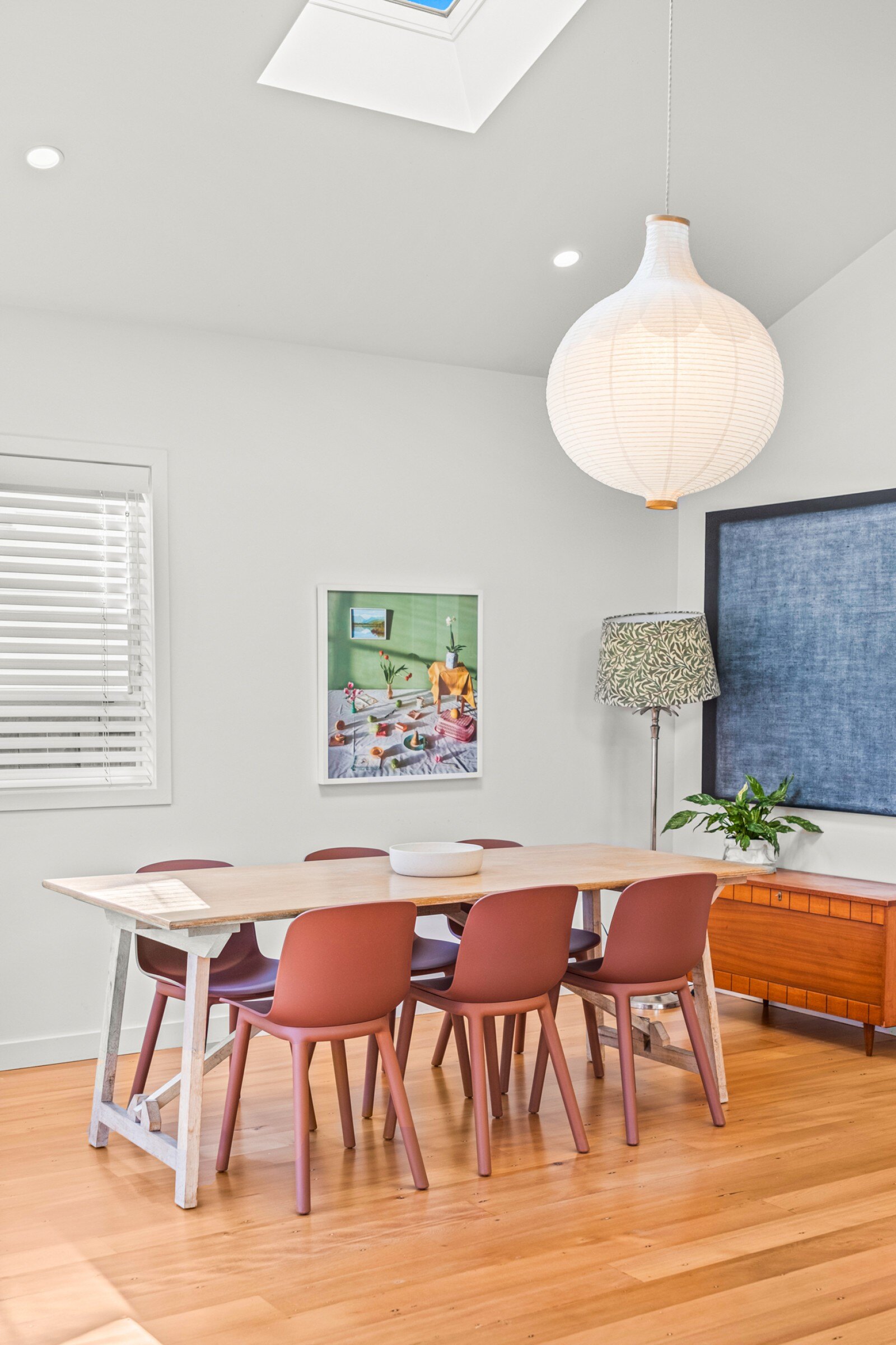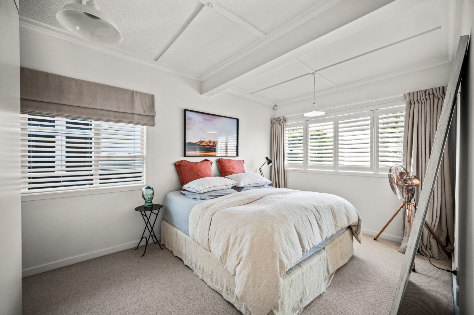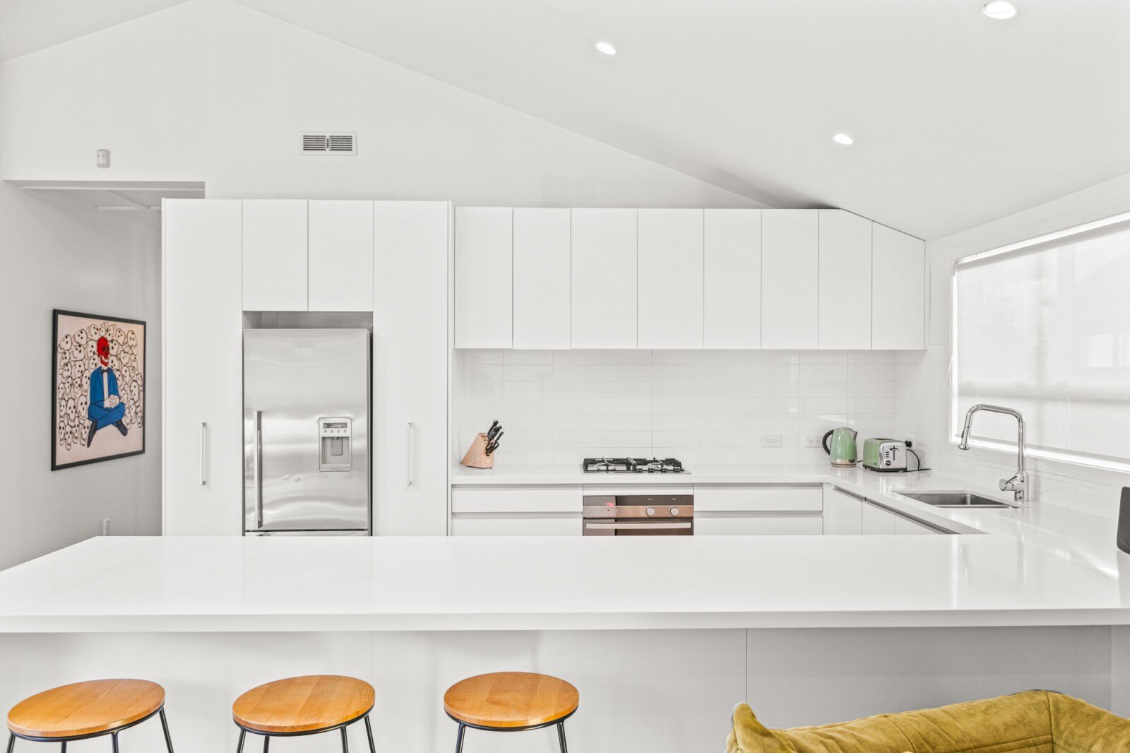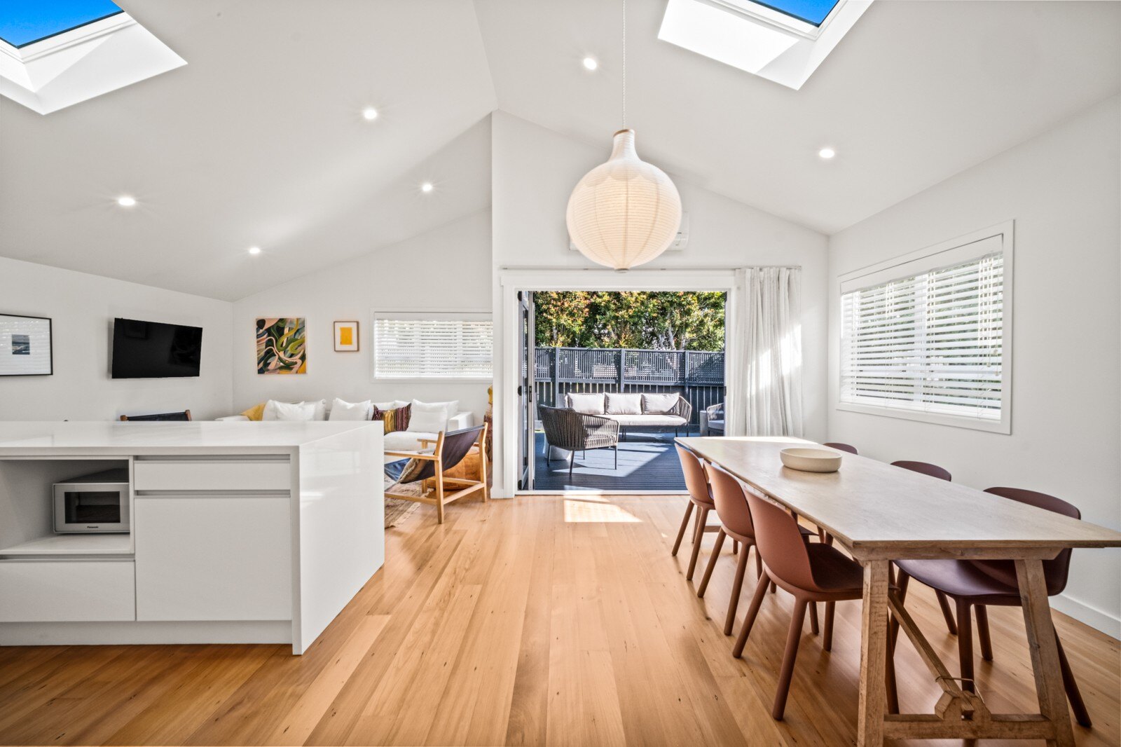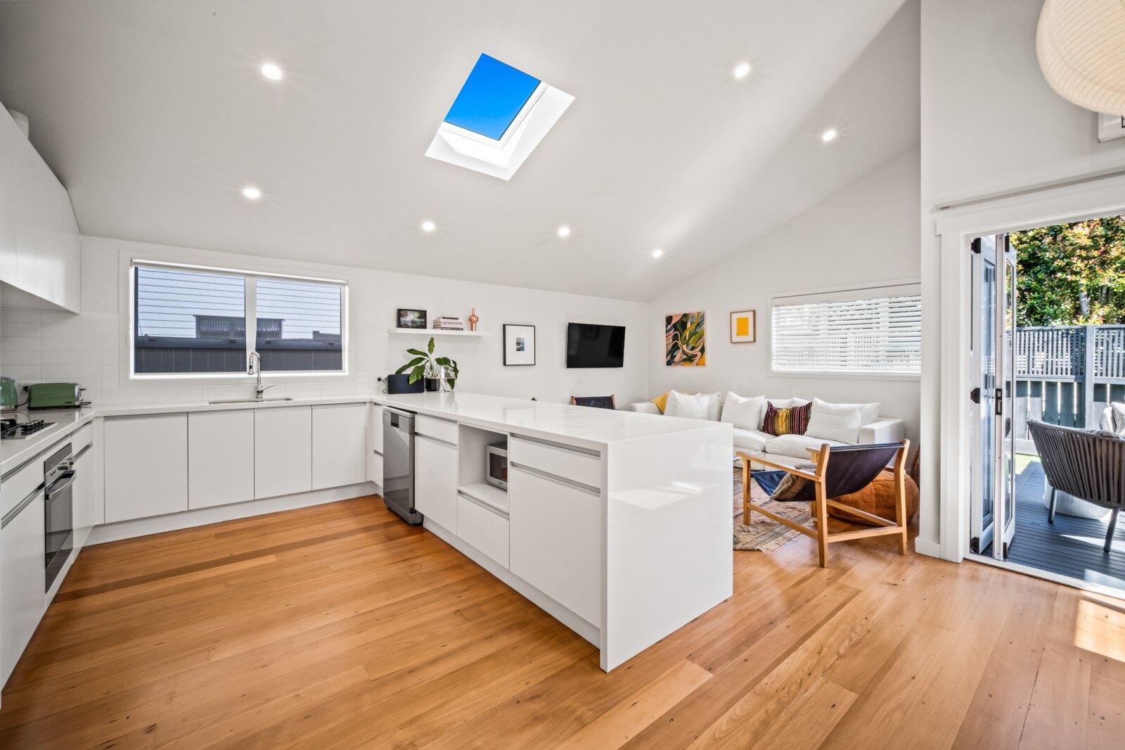 The classic bungalow layout ensures enjoyable living and unfolds to the serene and homely open plan living and dining area. High stud ceilings and skylights in the living area create a bright and airy atmosphere, further enhancing the overall sense of space and comfort. The generously sized designer kitchen with breakfast bar is perfect for families who love entertaining.