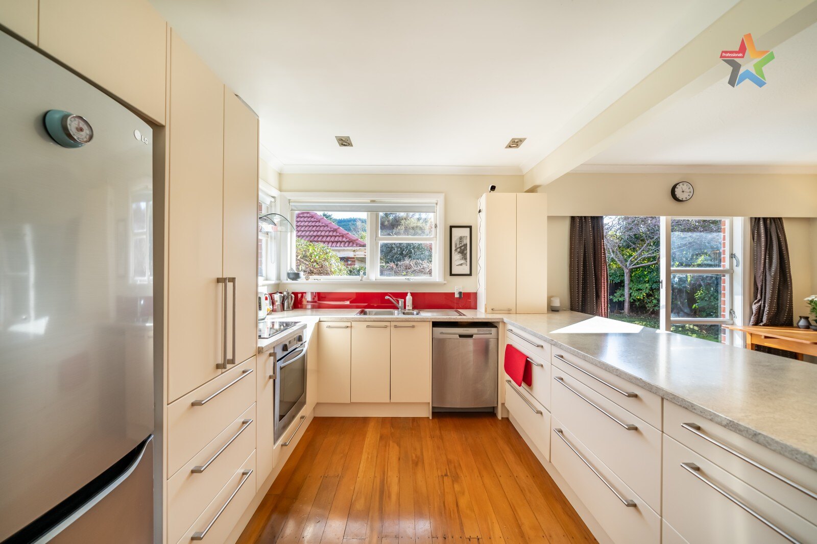 Open plan modern kitchen and dining that leads through to a spacious living area. Doors lead out from both the kitchen and living to the west facing backyard that looks over the Royal Wellington Golf Course.