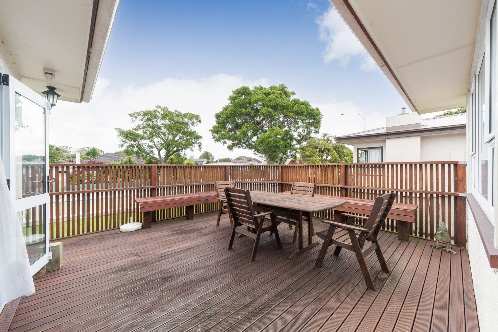 Doors from the lounge open onto a sunny deck, providing easy indoor-outdoor flow and a great space for relaxing or entertaining.