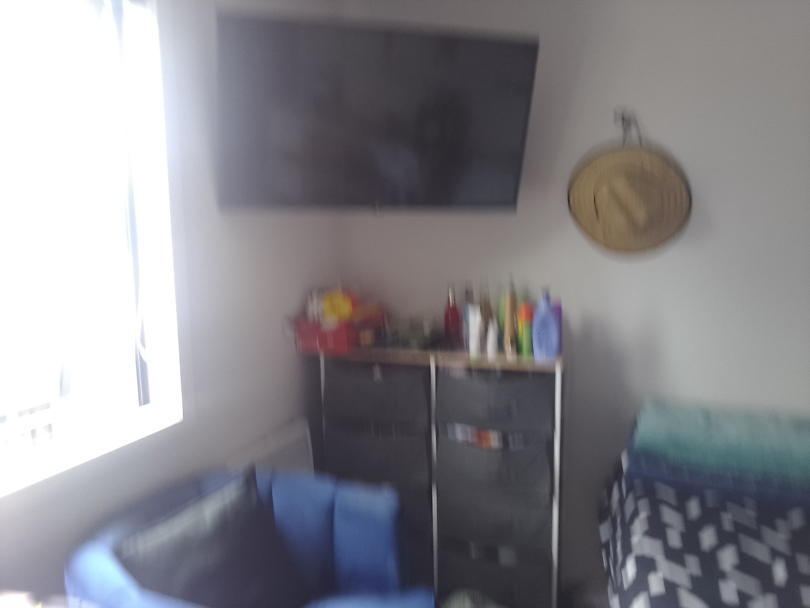 This is a bedroom with an ensuite - bed (no bedding), side table, chair, tv, small fridge and microwave.