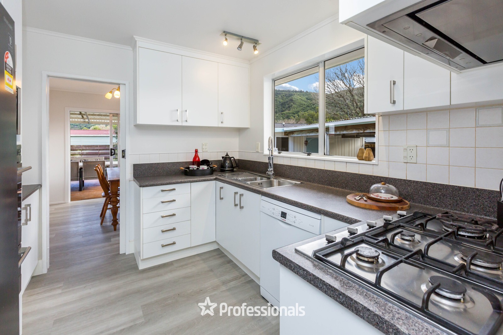 The modern kitchen is well equipped with a 1.5 bank oven, separate gas hobs and waste disposal, making every day meal prep a breeze. Just off the kitchen, the separate dining room flows seamlessly to a covered deck, perfect for outdoor living and entertaining. The spacious lounge can be closed off for privacy and includes both a gas fireplace and a heat pump for year-round comfort.