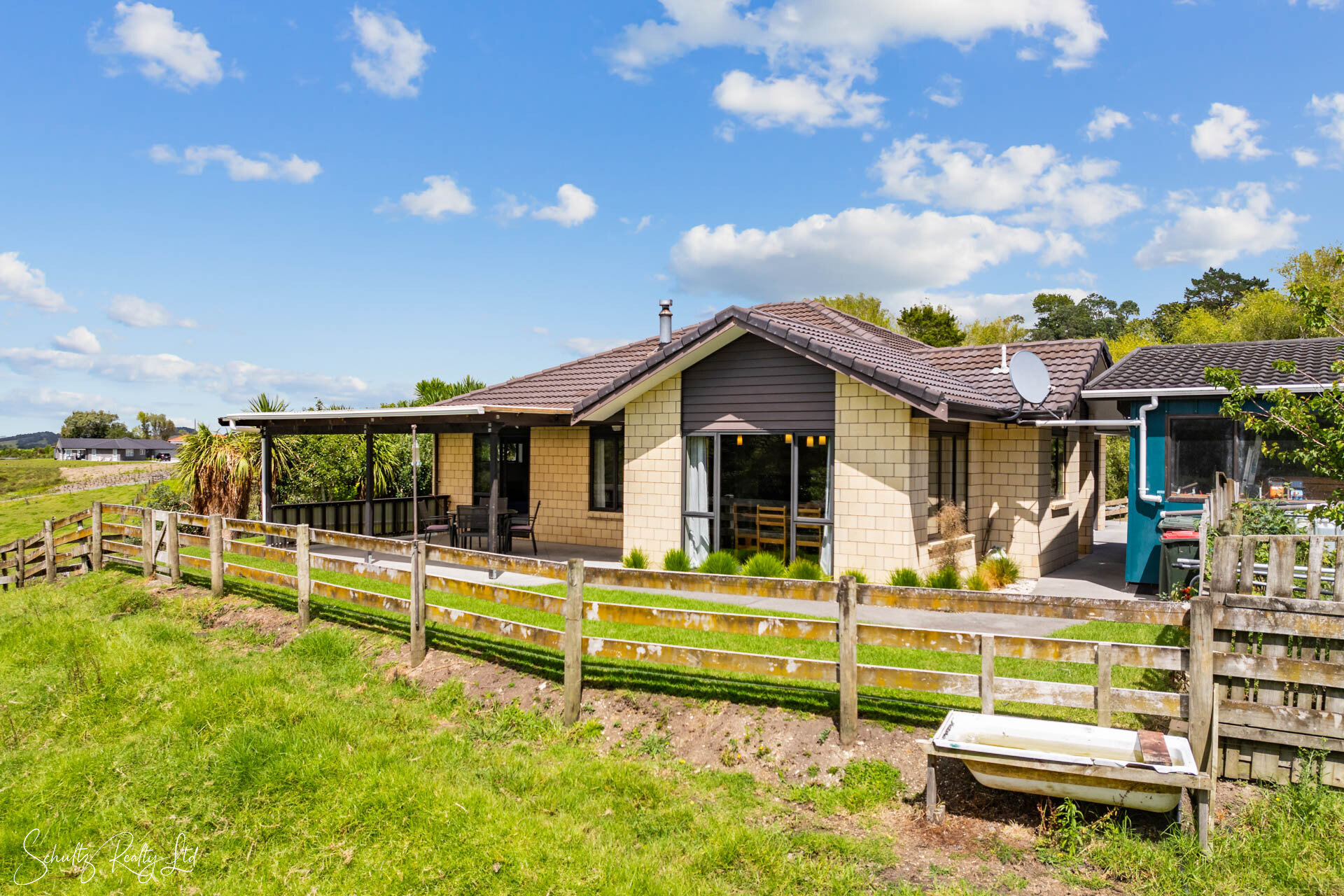 From the dining area, step out onto the covered outdoor space, perfect for alfresco dining and entertaining, all while enjoying the tranquil rural views that surround you.