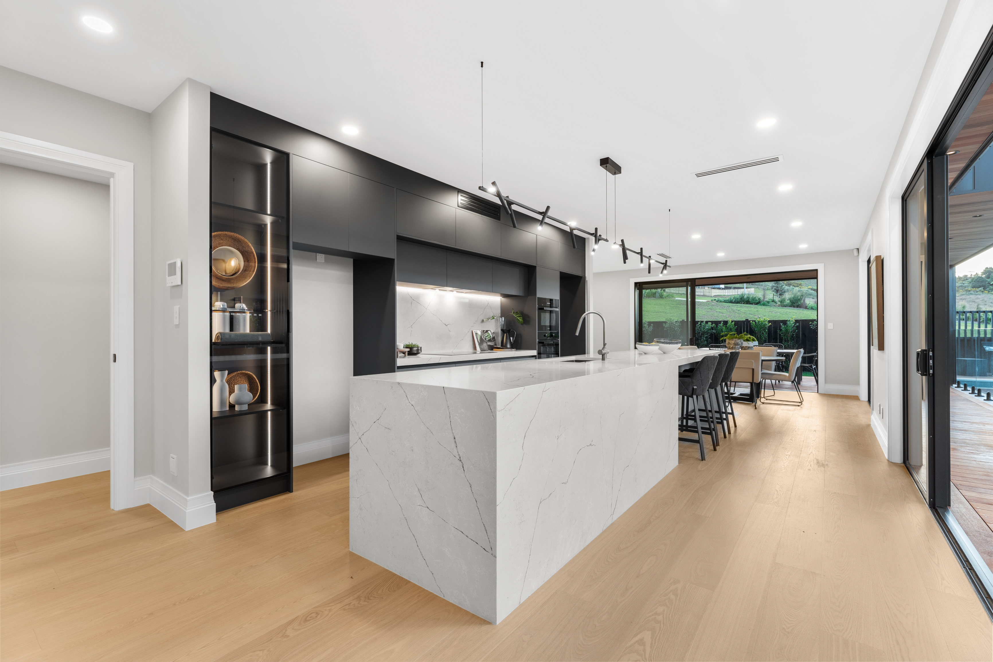 Spanning an impressive 360m2 floor area on a 525m2 section, this home offers space for the whole family and more. Two generously sized bedrooms are located downstairs, while upstairs features a luxurious master suite with a private ensuite and oversized walk-in wardrobe, plus two additional bedrooms each with its own walk-in wardrobe and private bathrooms. A striking catwalk overlooks one of 3 living areas, adding architectural flair, while engineered hardwood floors bring warmth and sophistication throughout.