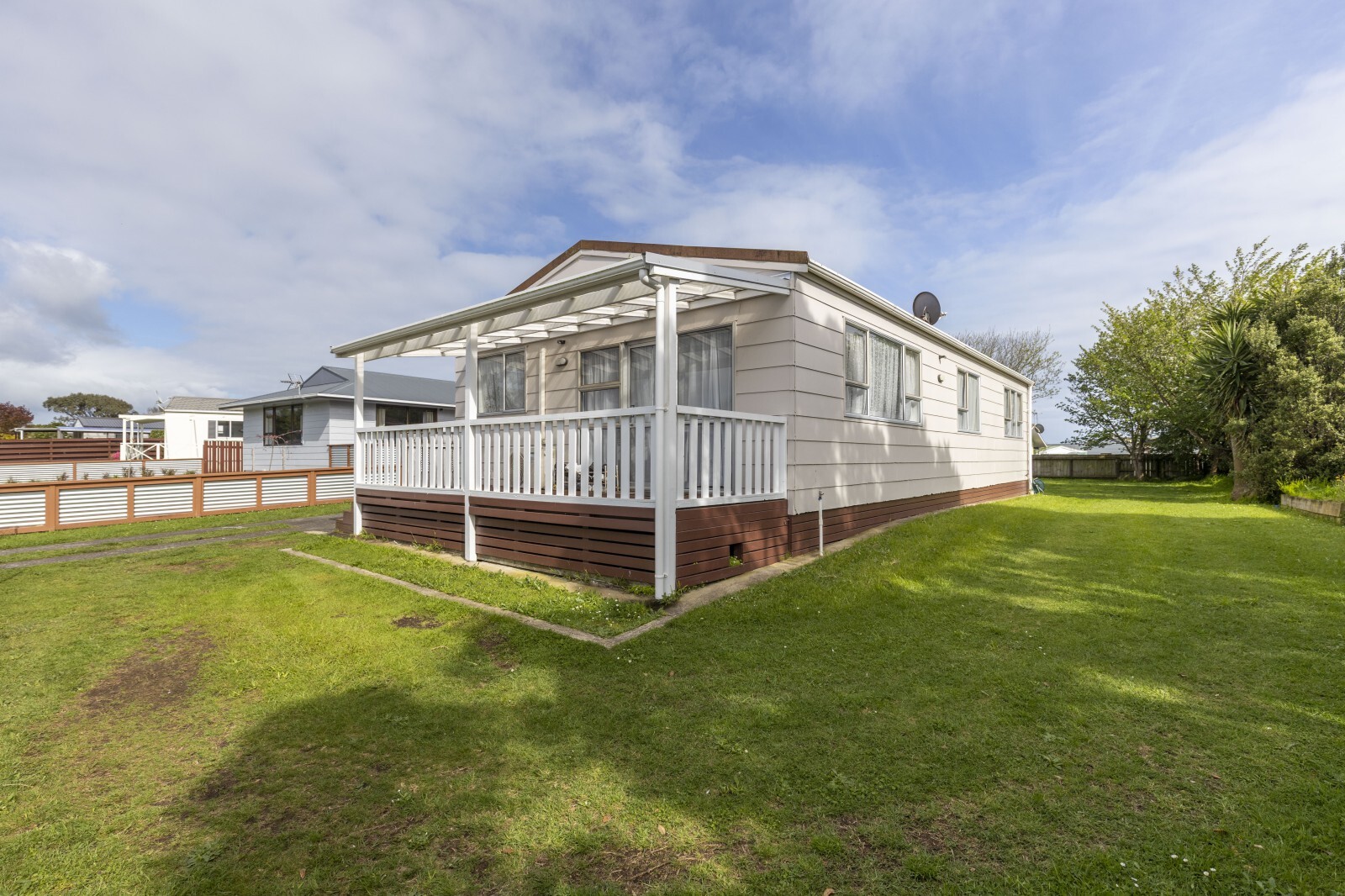Inside, you’ll find a spacious living area and three double bedrooms, each with built-in storage. The modern kitchen and bathroom have been renovated, complemented by new flooring, updated plumbing, and the addition of a SmartVent system and heat pump for year-round comfort.