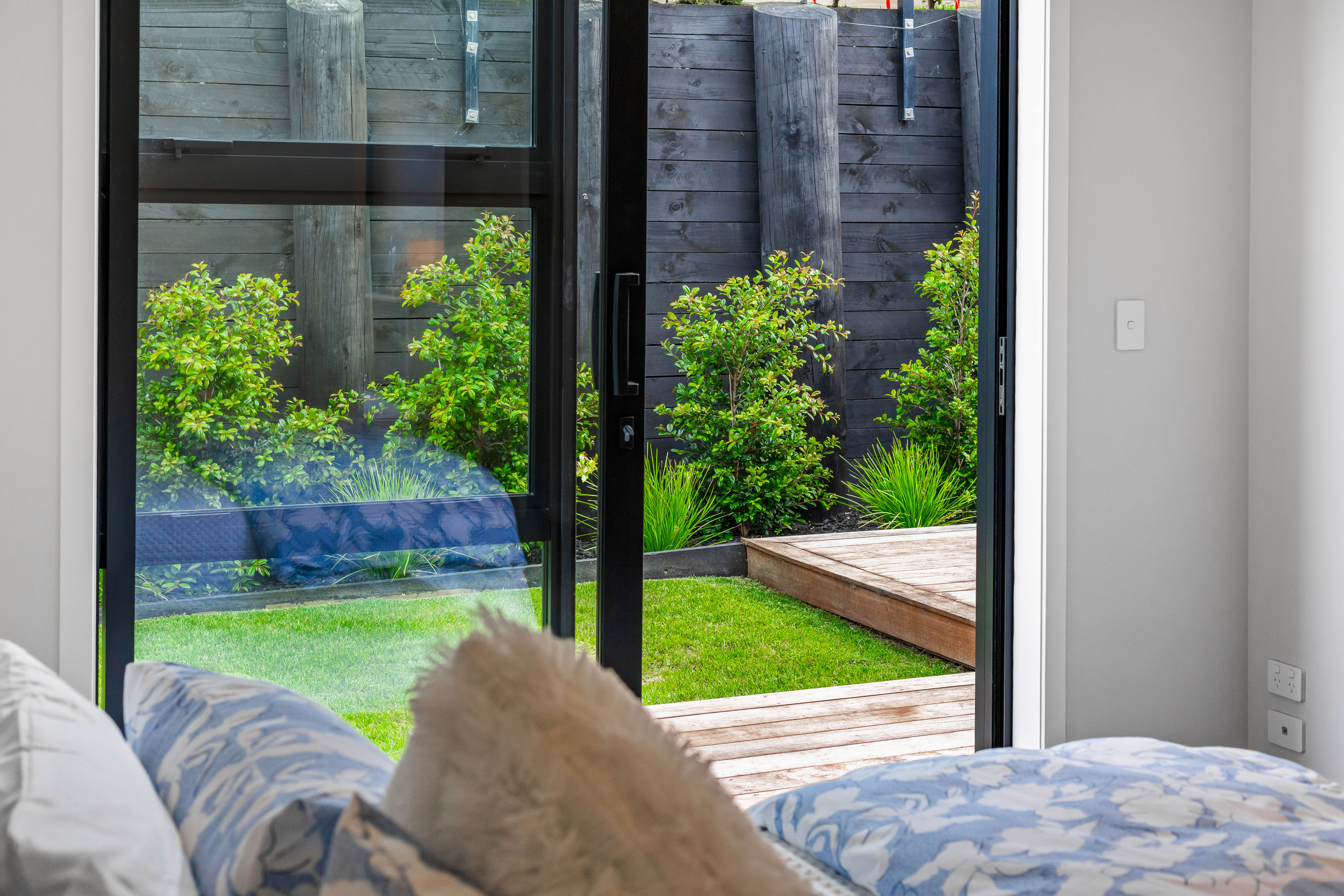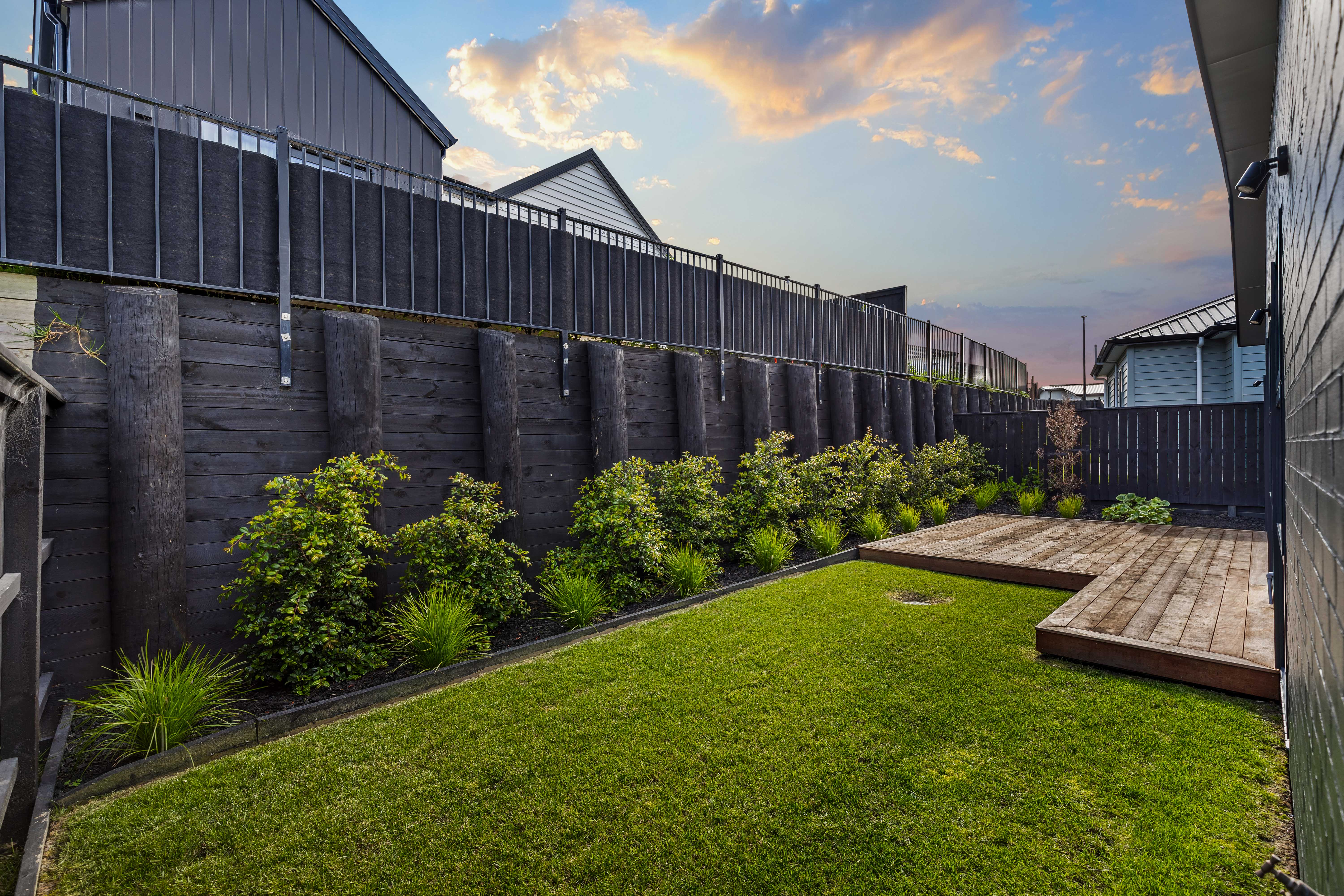 • Sunny Kwila deck and landscaped, low-maintenance backyard