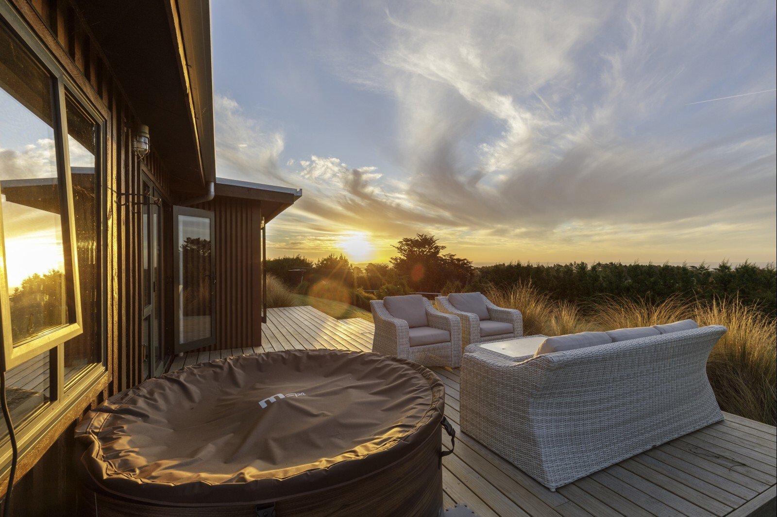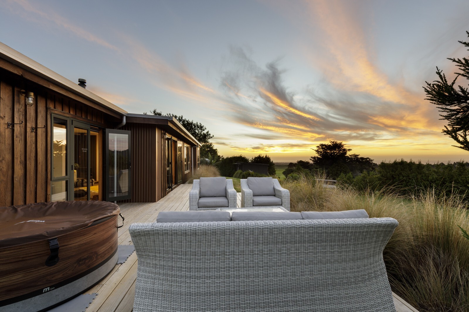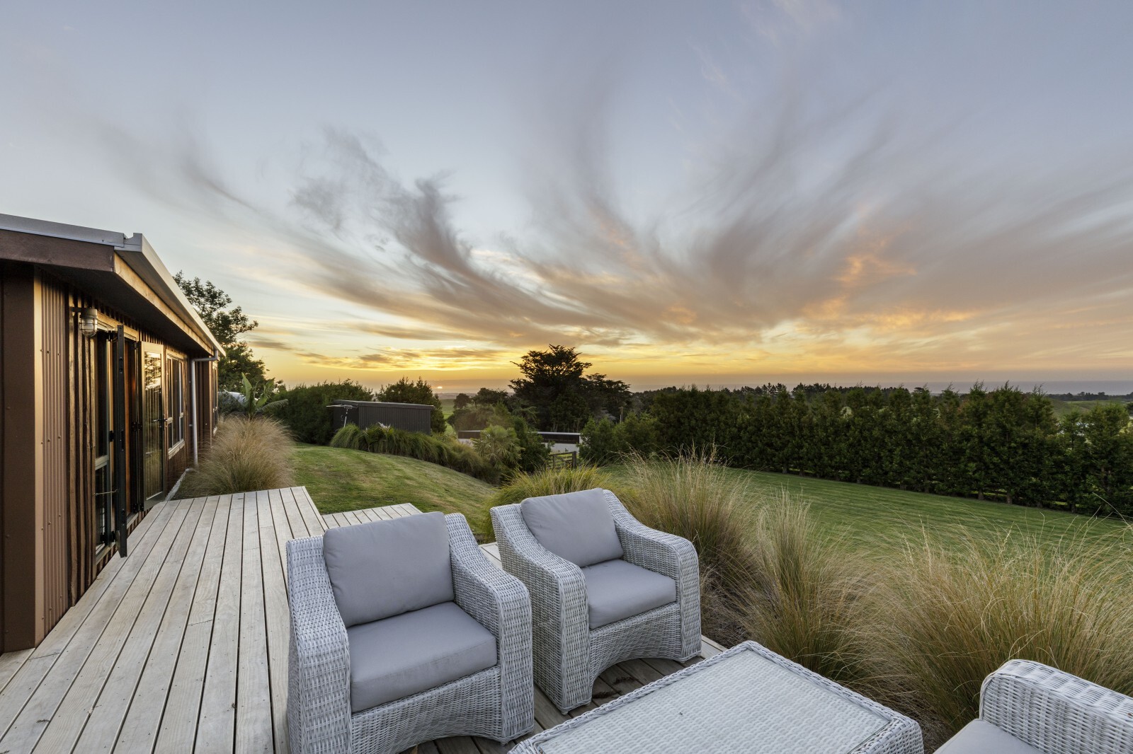 The views are nothing short of breathtaking — stretching from Mount Taranaki and the dramatic Kaitake and Pouakai Ranges, across rolling green pasture, and sweeping outward to a magnificent 180-degree panorama of coastline and ocean. It’s expansive. It’s private. It’s powerful.