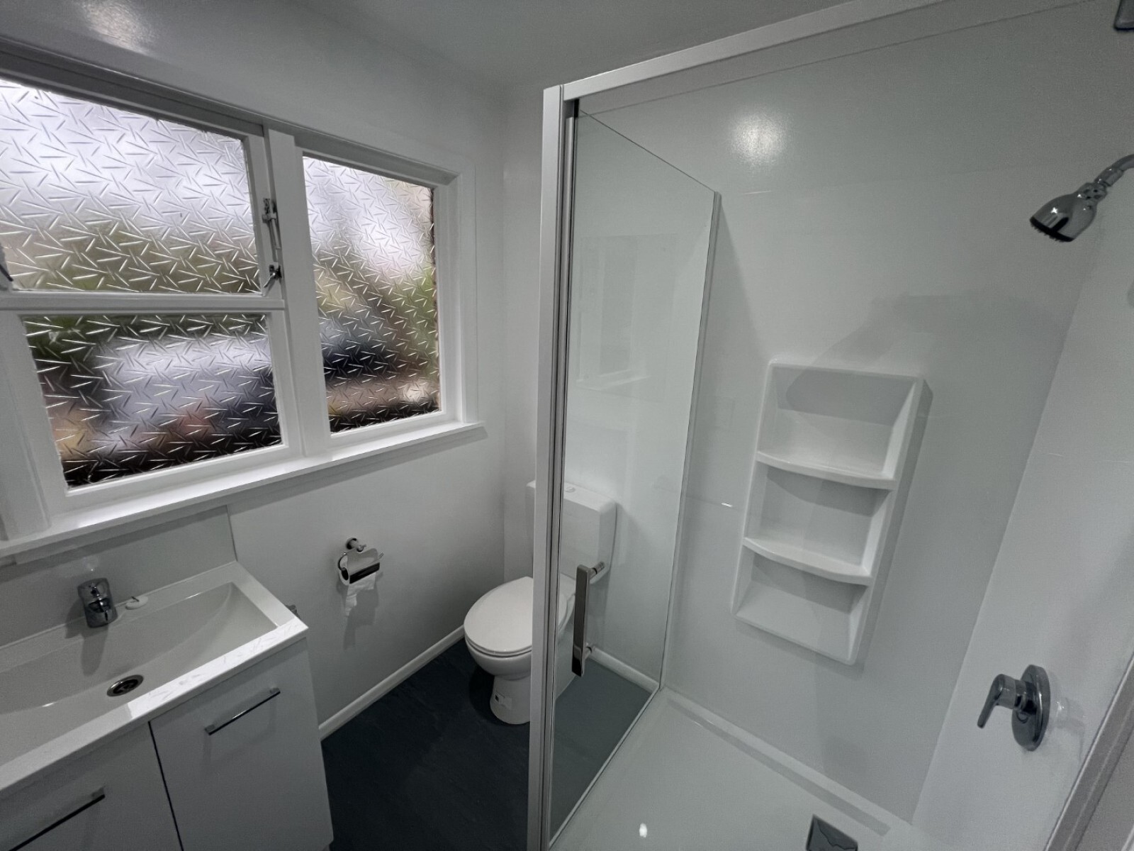 - Bathroom includes shower, toilet and vanity