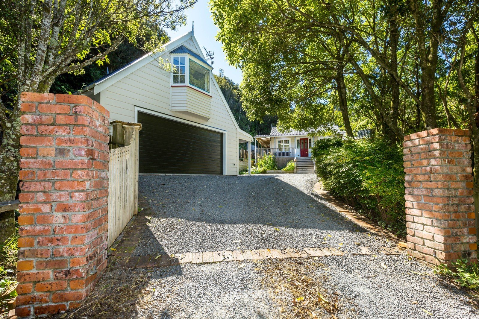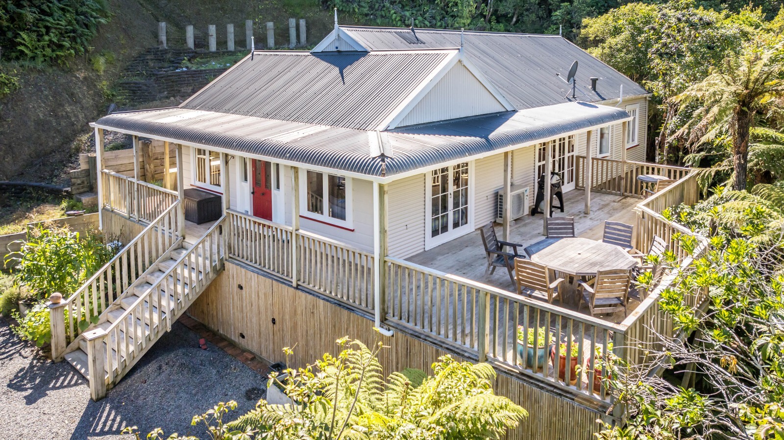 Inside, the high stud tongue and groove ceiling and open plan living create a real sense of space. The light-filled lounge flows seamlessly to wrap-around decking through French doors, making the most of the private native bush outlook.