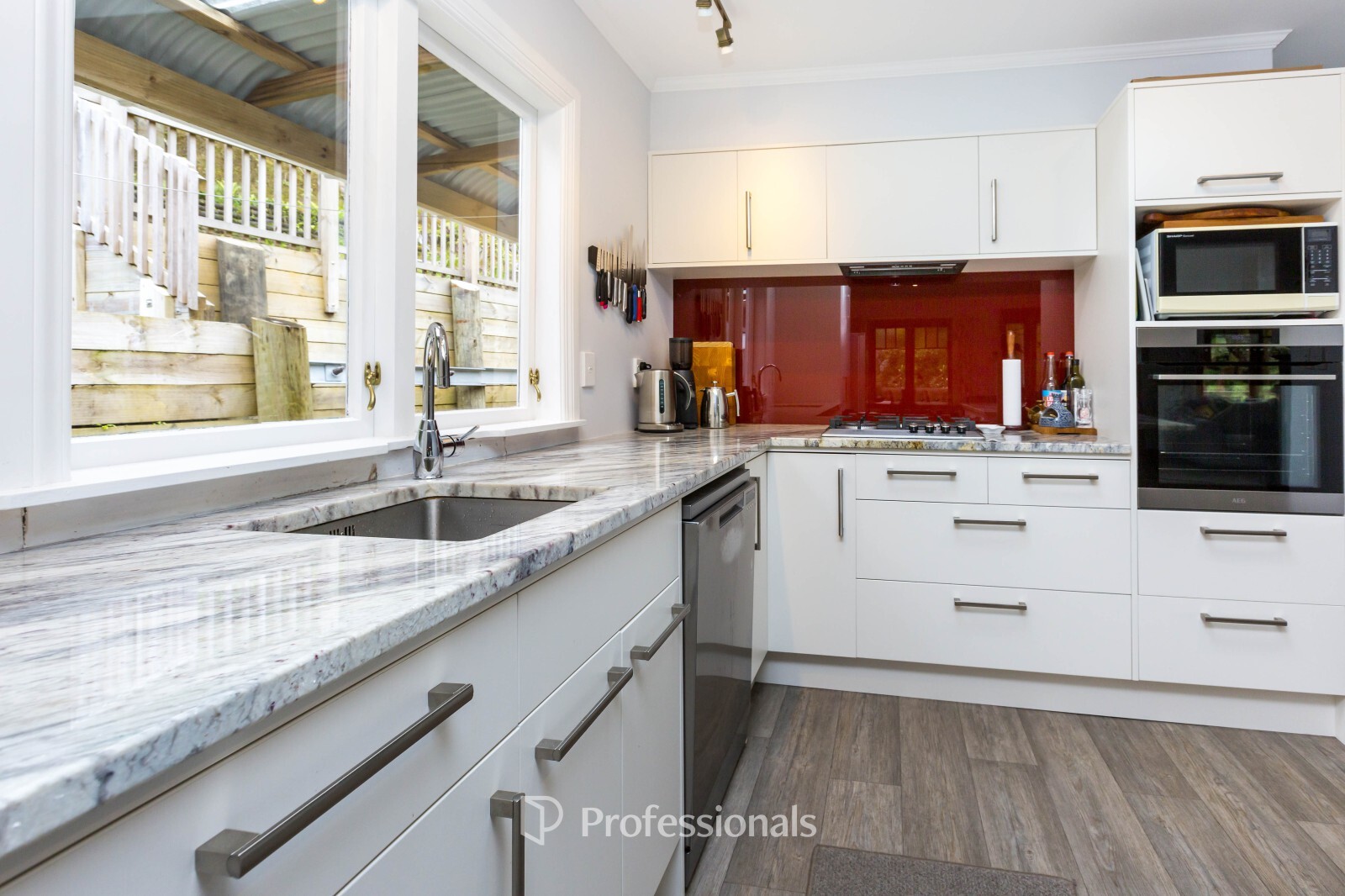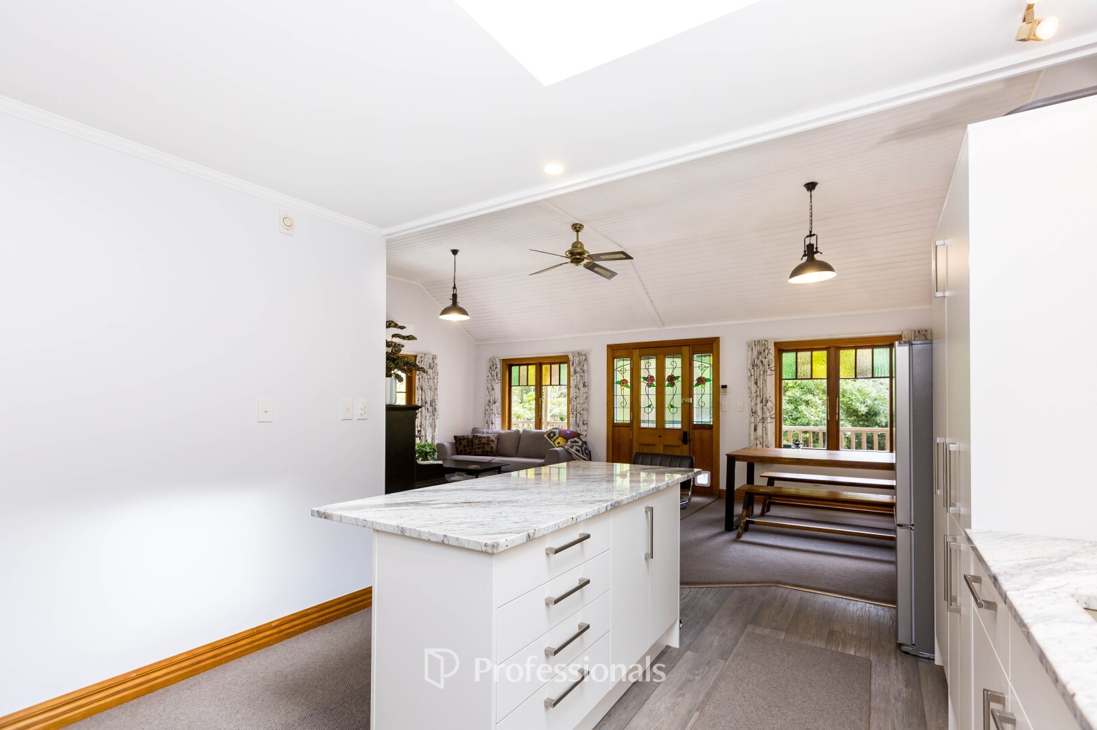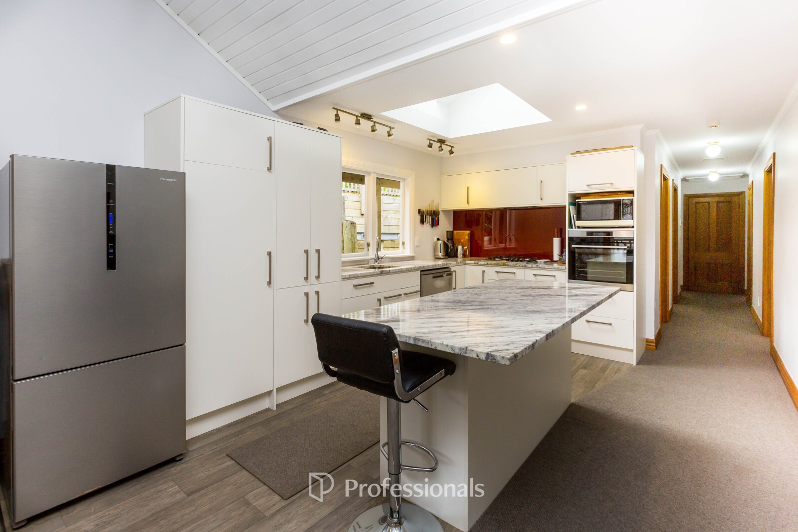 The modern kitchen is well appointed with marble benchtops, gas cooking, a central island, and great storage, while a skylight enhances natural light.