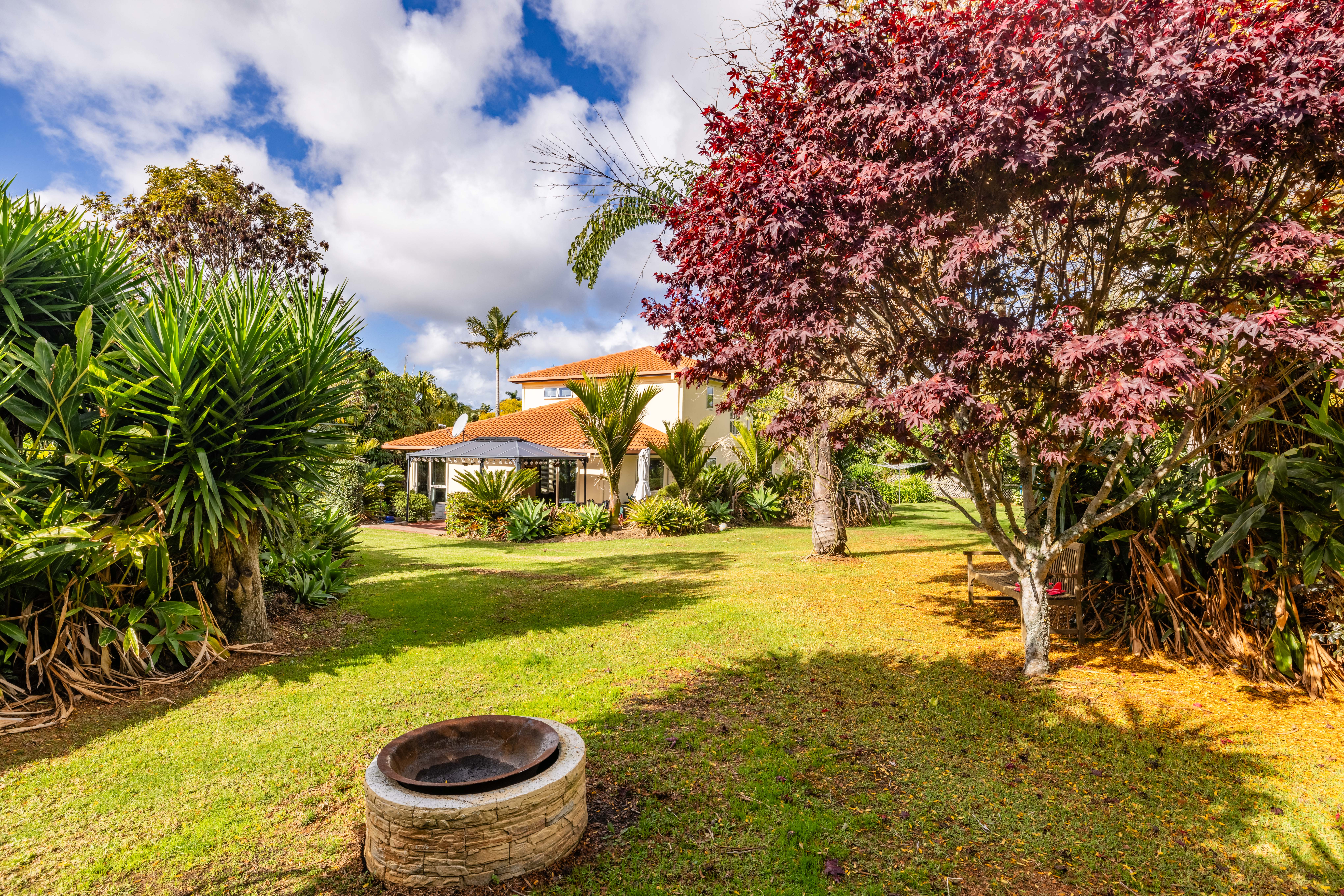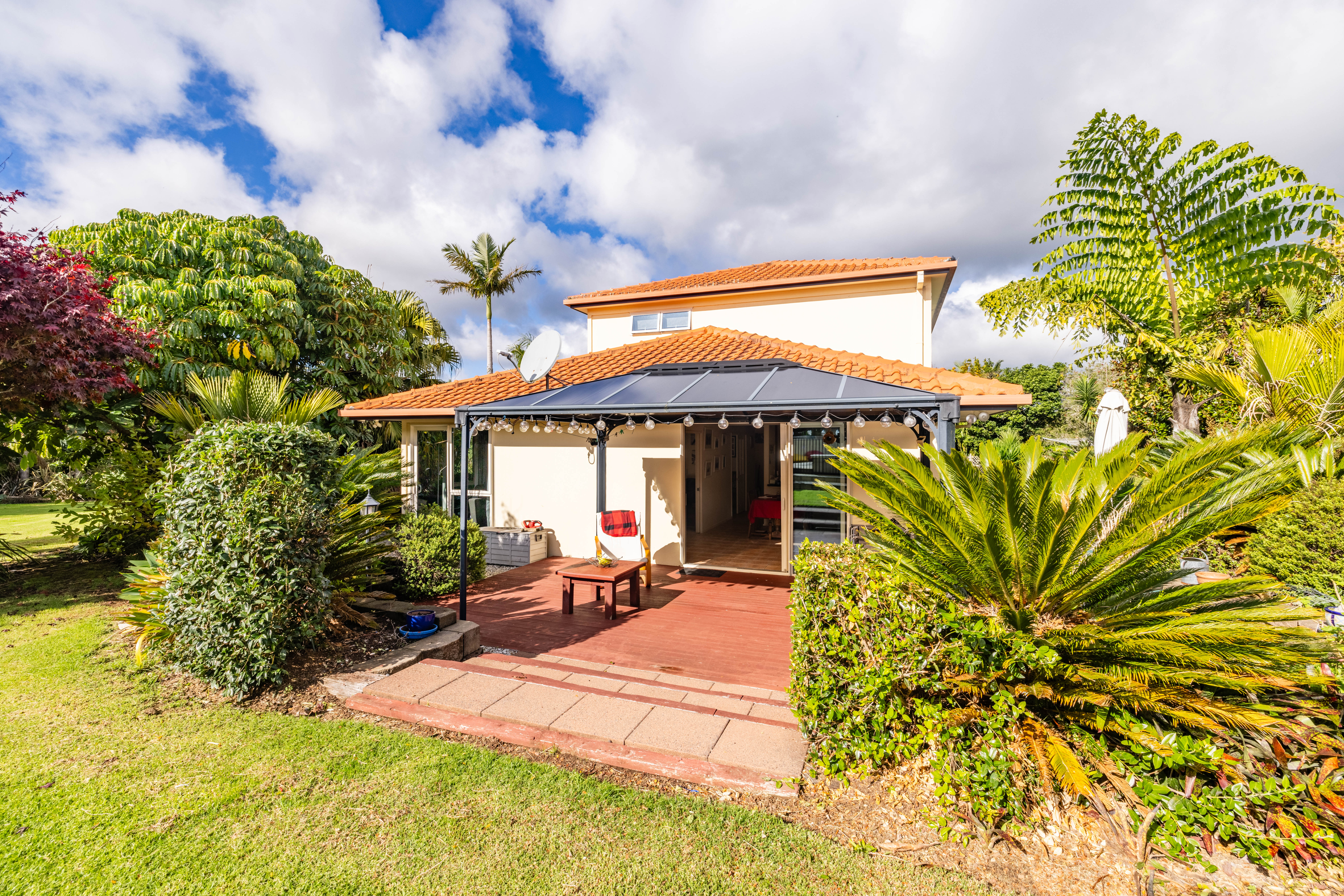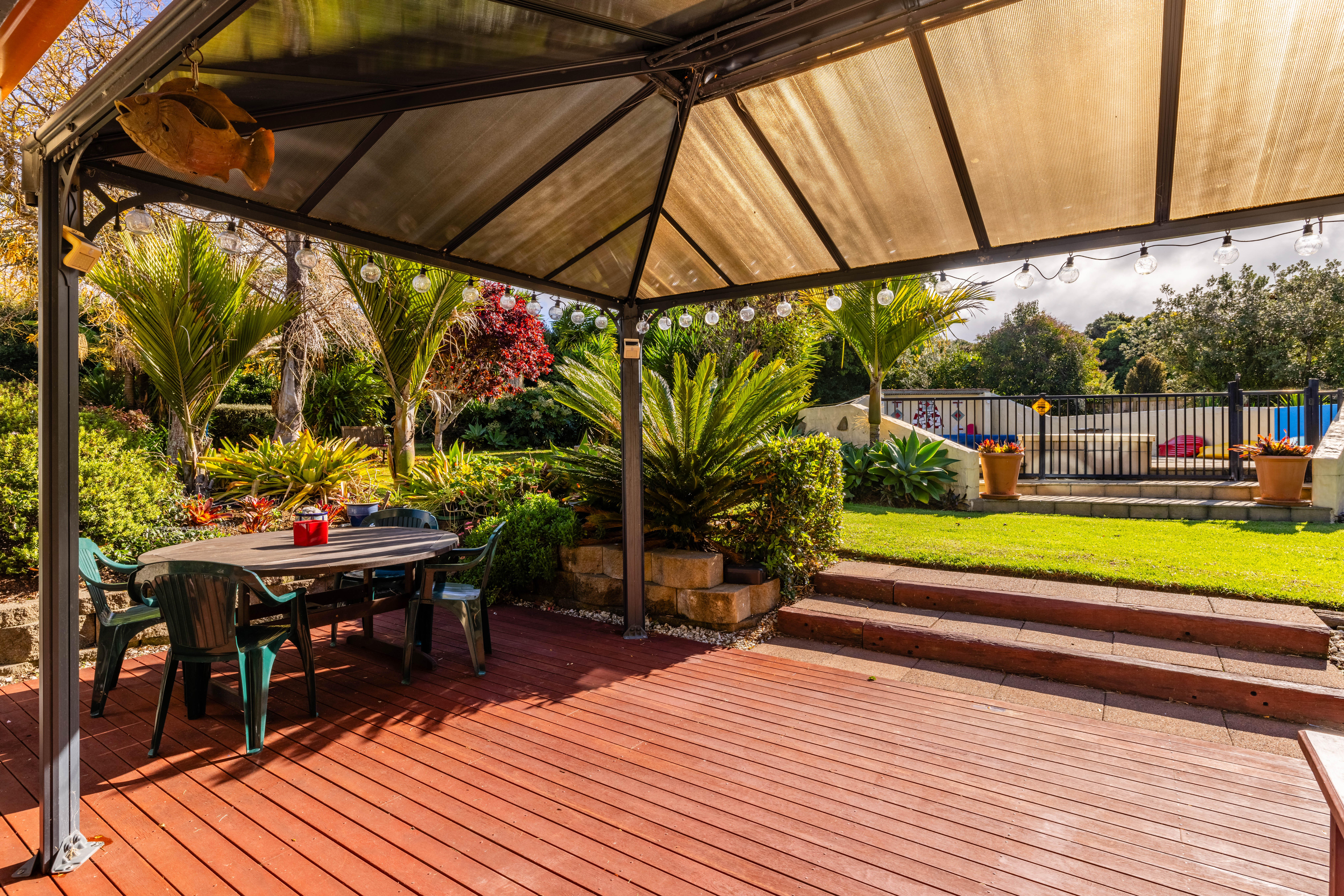 The north-facing home boasts large tinted double-glazed windows, an Australian Tuscan terracotta tiled roof, and plastered cladding, offering impressive touches of class throughout the home. The atmosphere is further heightened by the easy maintenance of the double glazing, ceiling fans, and heat pumps that ensure comfort in all seasons. The day room and kitchen have a large ranch slider that opens out onto the patio deck and gazebo so is a perfect place for family and friends to gather for daily use or parties.