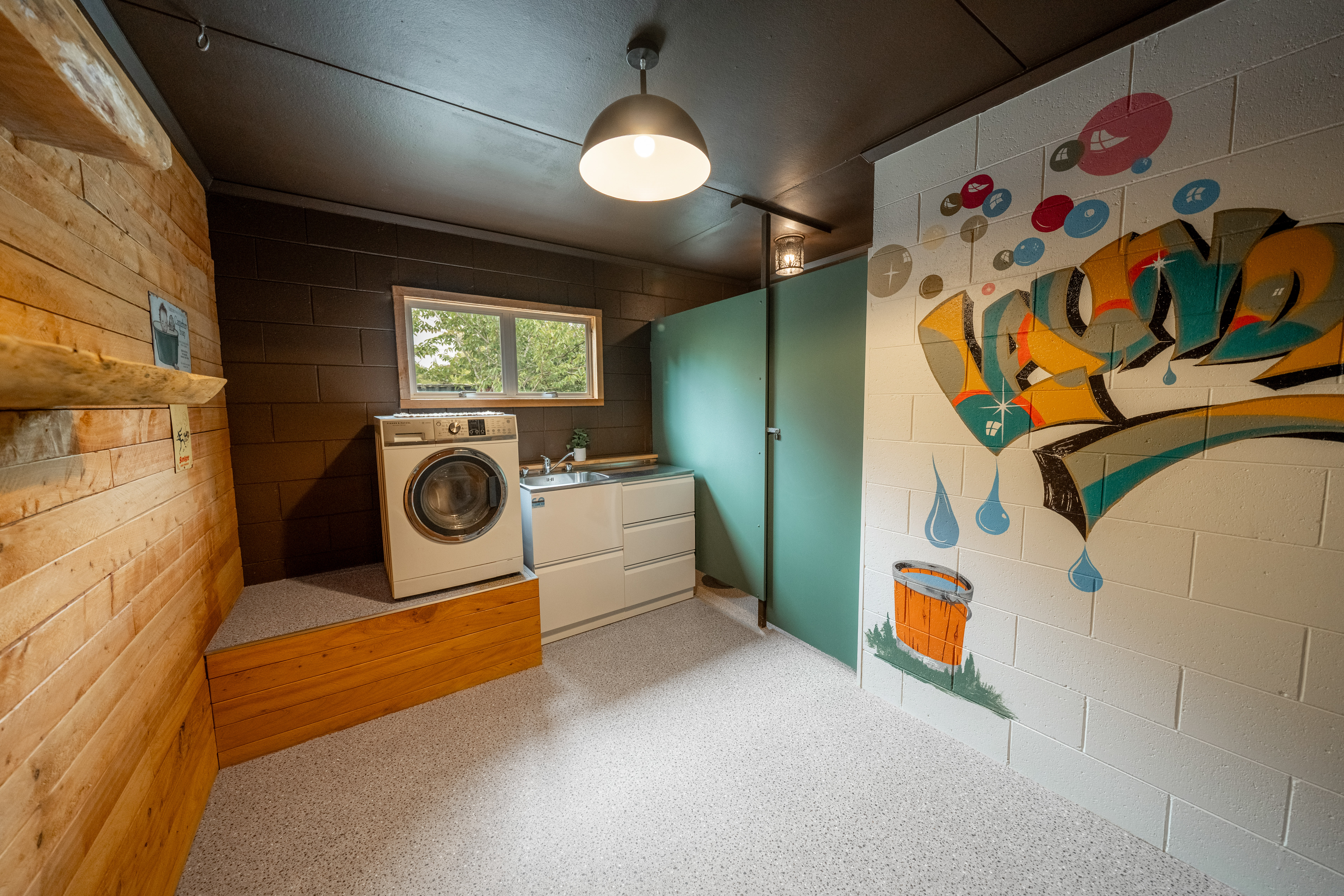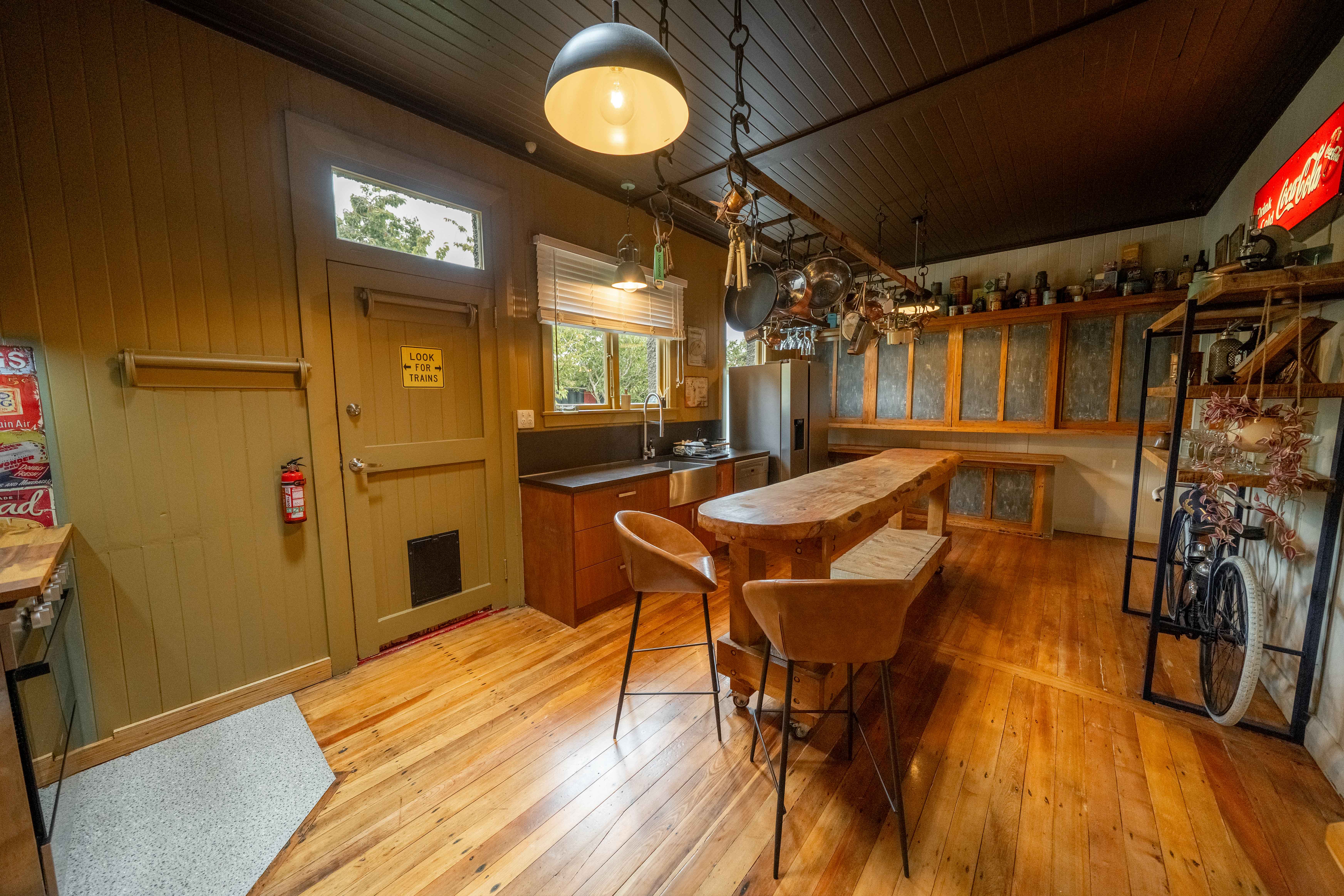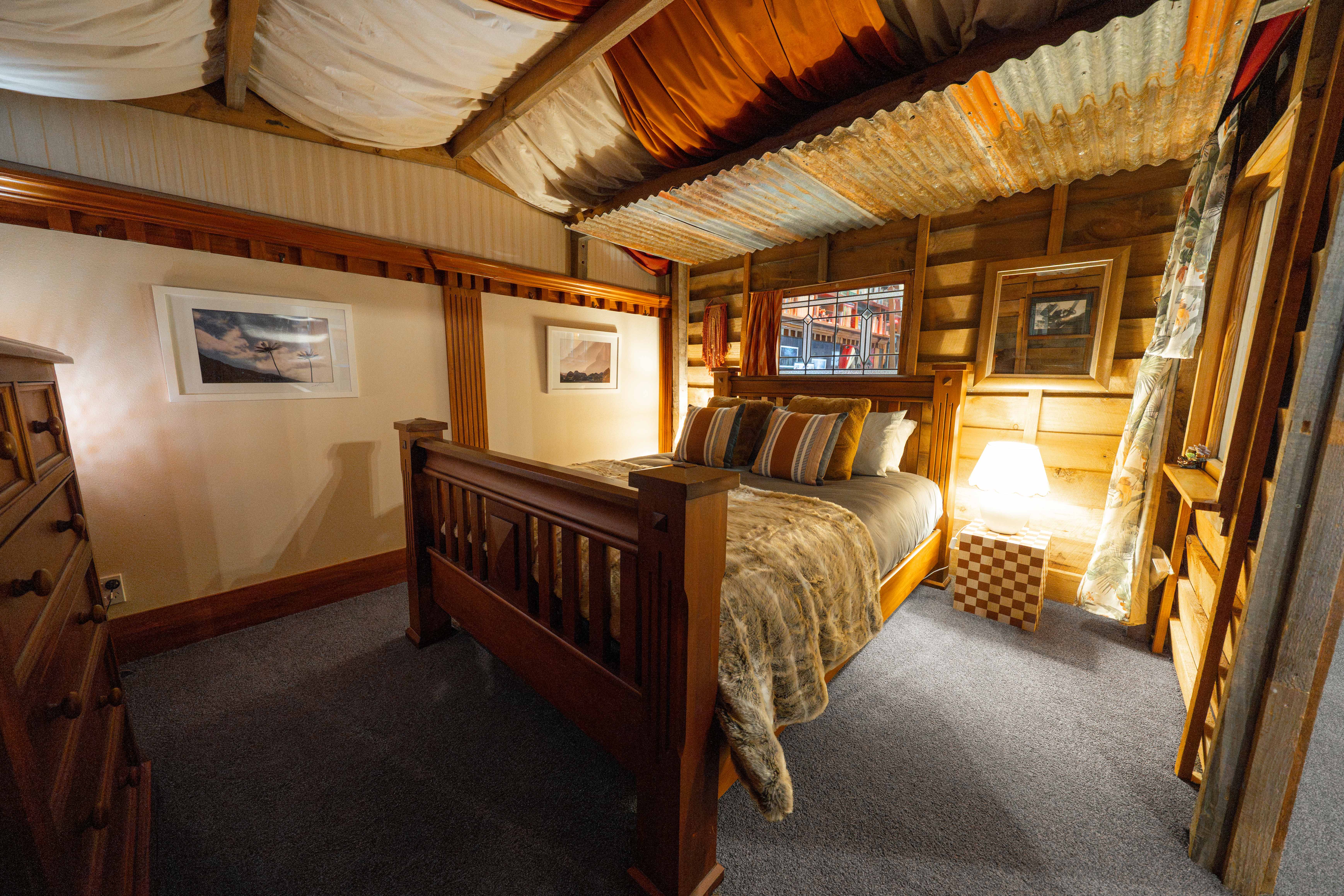 The former hall has been transformed into a uniquely decorated living space with remarkable artistic flair. Under the soaring ceiling, two intimate sleeping areas have been cleverly created within smaller "rooms within a room," echoing the charm of old-world design. A spacious, well-equipped kitchen, bathroom plus luxury bath area, and separate laundry enhance everyday comfort.