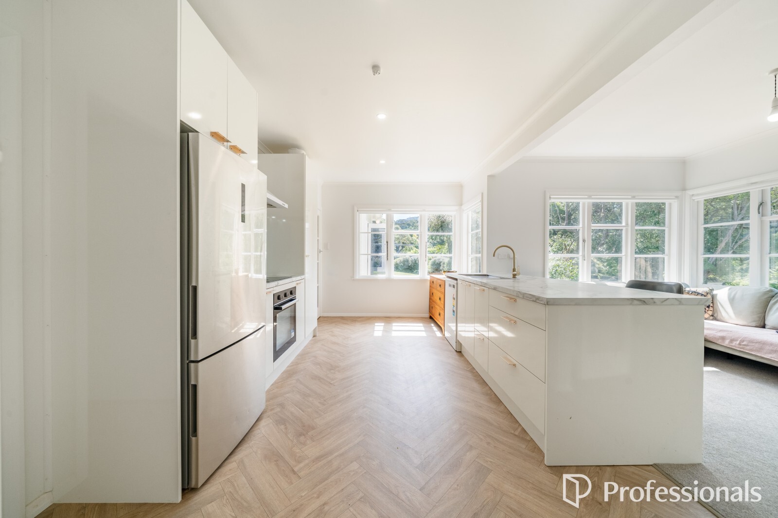 The large, wrap-around living room provides a spacious, inviting hub, plus there’s an additional living or separate dining area, seamlessly flowing into the new, galley-style kitchen, ideal for entertaining or family meals.