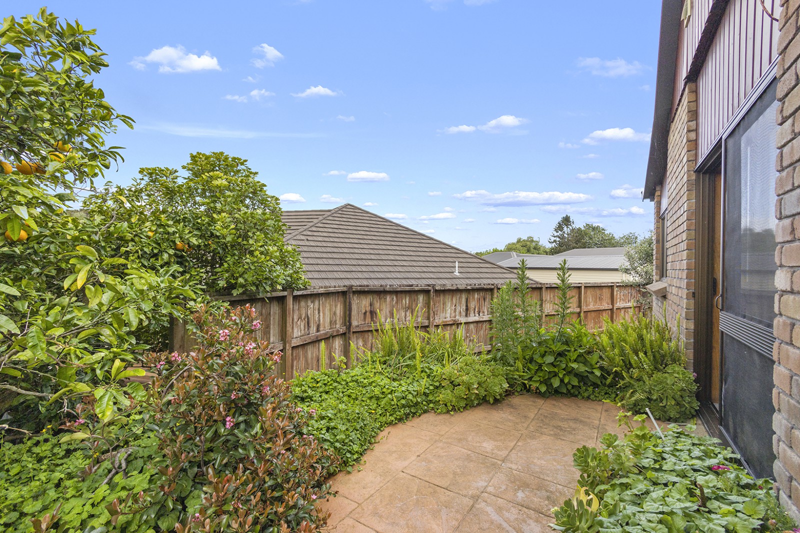 * Living room steps through a ranch slider to a courtyard