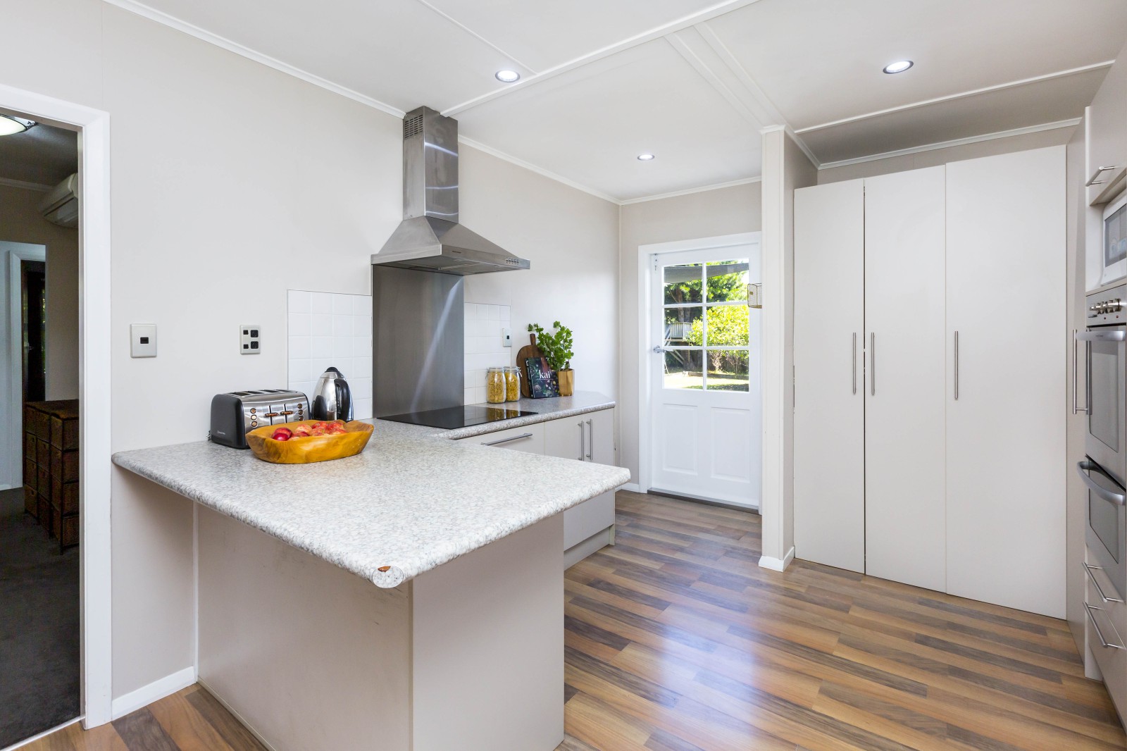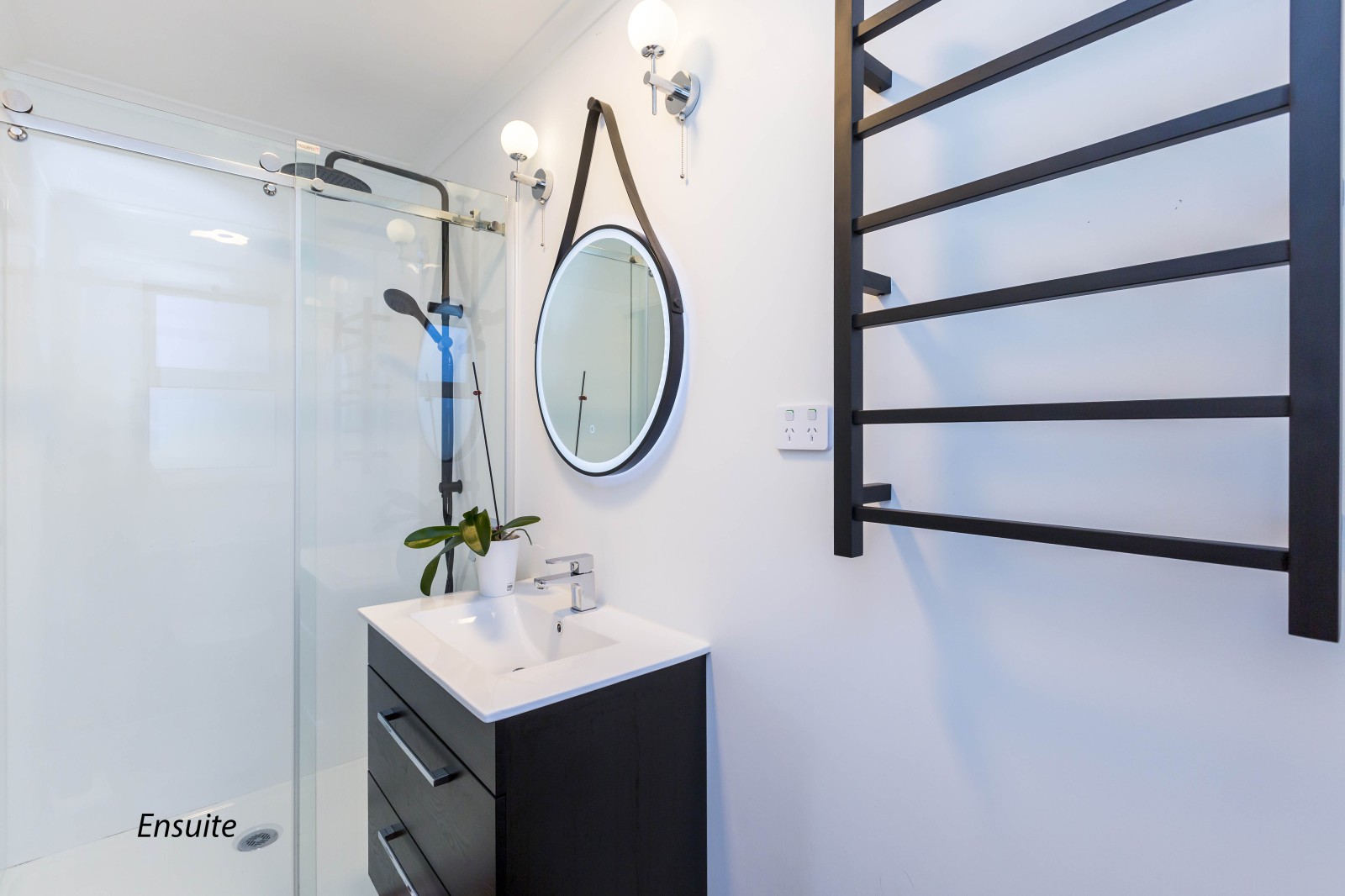 The master bedroom is a sanctuary, featuring French doors that open out onto the sun filled decked area and flat section. The room is equipped with LED sensor lights, adding a touch of luxury and convenience. The ensuite in the master bedroom is a spa-like retreat, complete with a shower, vanity, toilet, and a heated towel rail - perfect for unwinding after a long day. The main bathroom is equally impressive, offering a relaxing atmosphere with a bath, shower, double vanity, and a separate toilet.