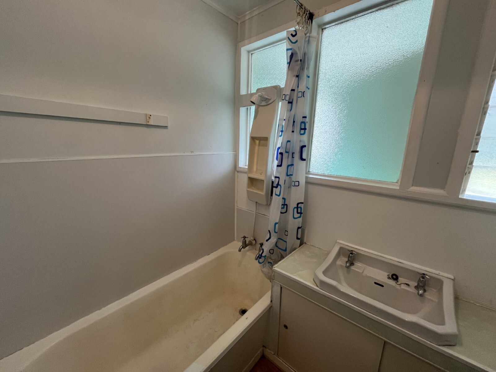 - Bathroom with shower over bath and vanity