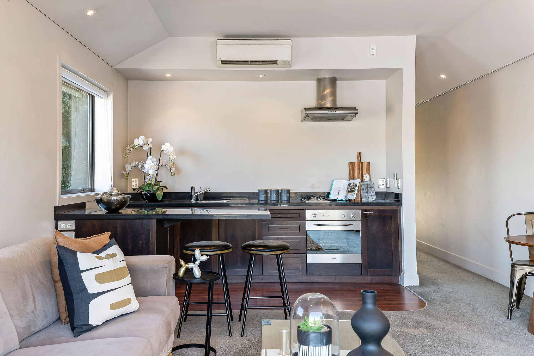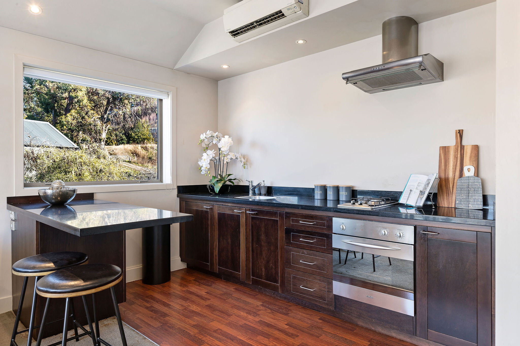The upstairs apartment has open plan full sized kitchen and living with bifold doors that flows out onto the deck where you can enjoy your morning coffee while taking in the snowcapped Remarkables.
