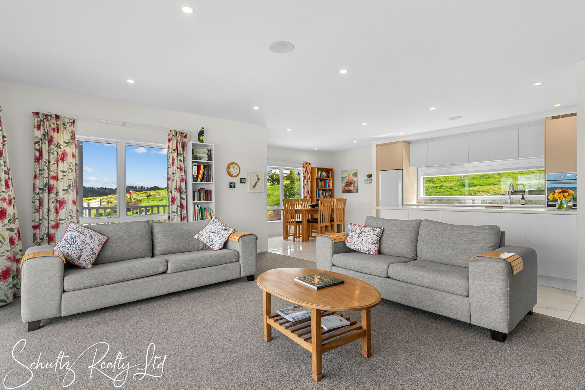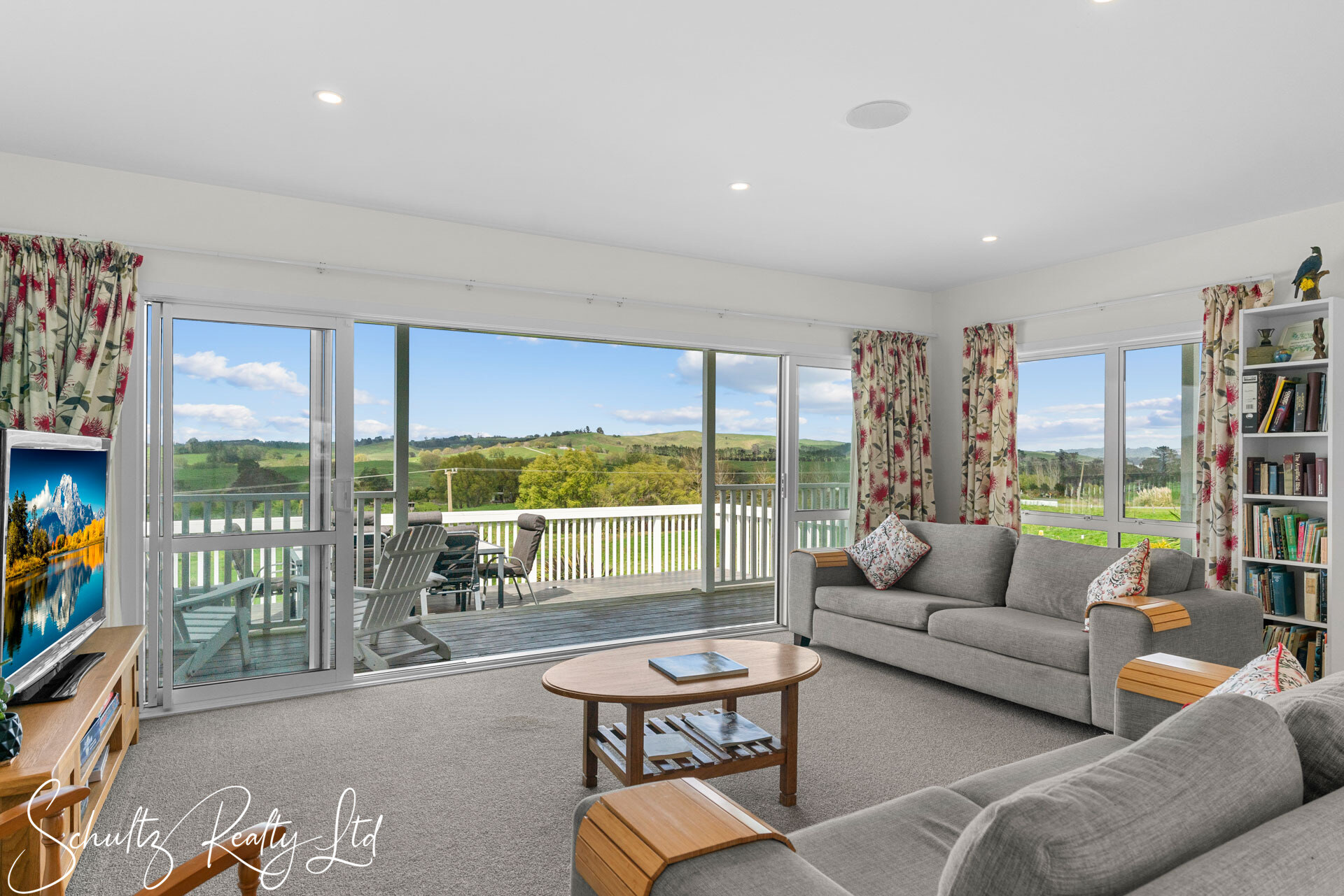 Step inside to an open-plan living, dining, and kitchen area where elegance meets functionality. The sleek kitchen boasts beautiful bench tops, an induction hob, whisper-quiet range hood, and a spacious scullery. The large living area, warmed by a heat pump, flows effortlessly to a massive wraparound deck with spectacular rural views-perfect for entertaining or relaxing.
