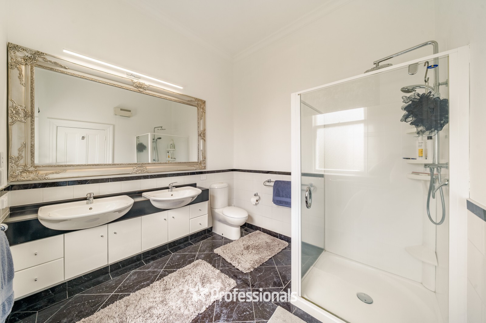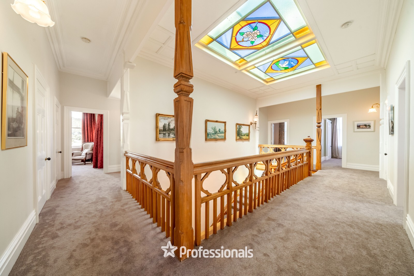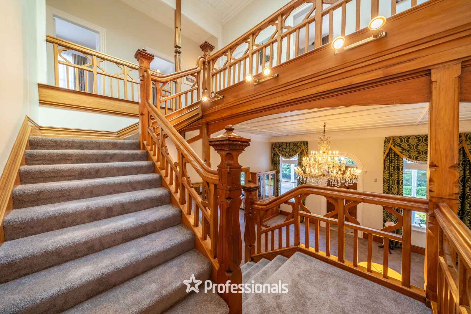The sweeping staircase is a work of art in itself, leading to five bedrooms upstairs, including the premier suite with a large walk-in robe and ensuite. A sixth bedroom is located on the ground floor, offering flexibility for guests, extended family, or a home office. Two additional family bathrooms, along with a separate gardener's toilet accessible from outside, provide practicality to match the home’s grandeur.