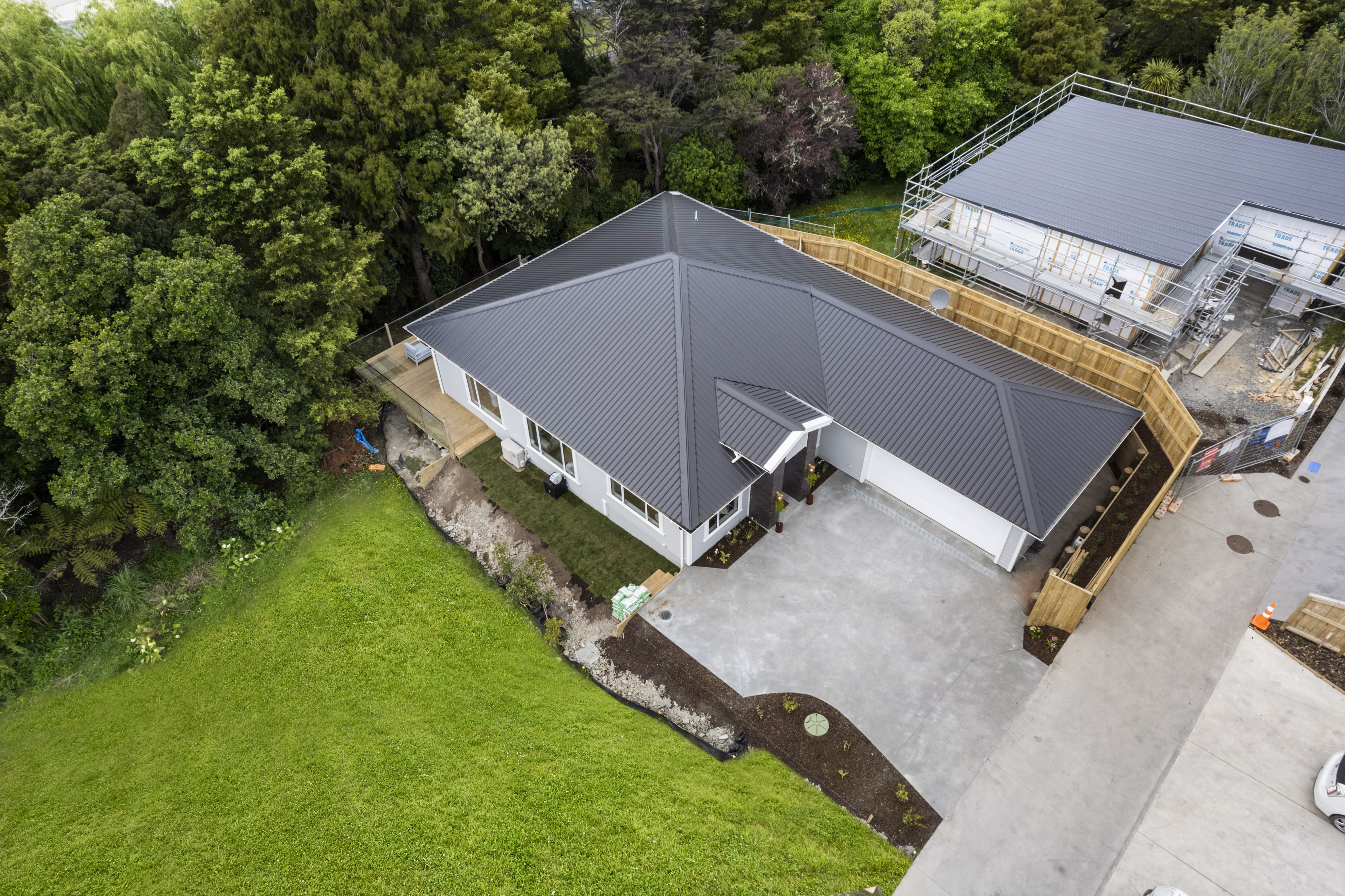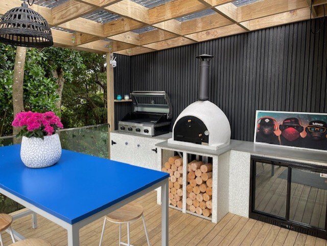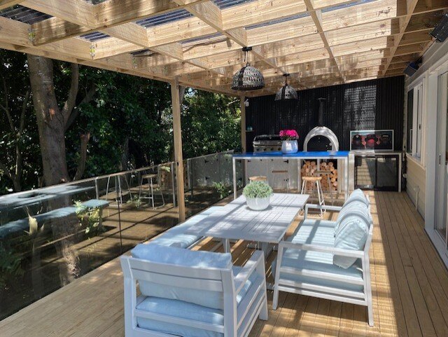 Large outdoor entertaining area with BBQ space, surrounded by trees for added privacy