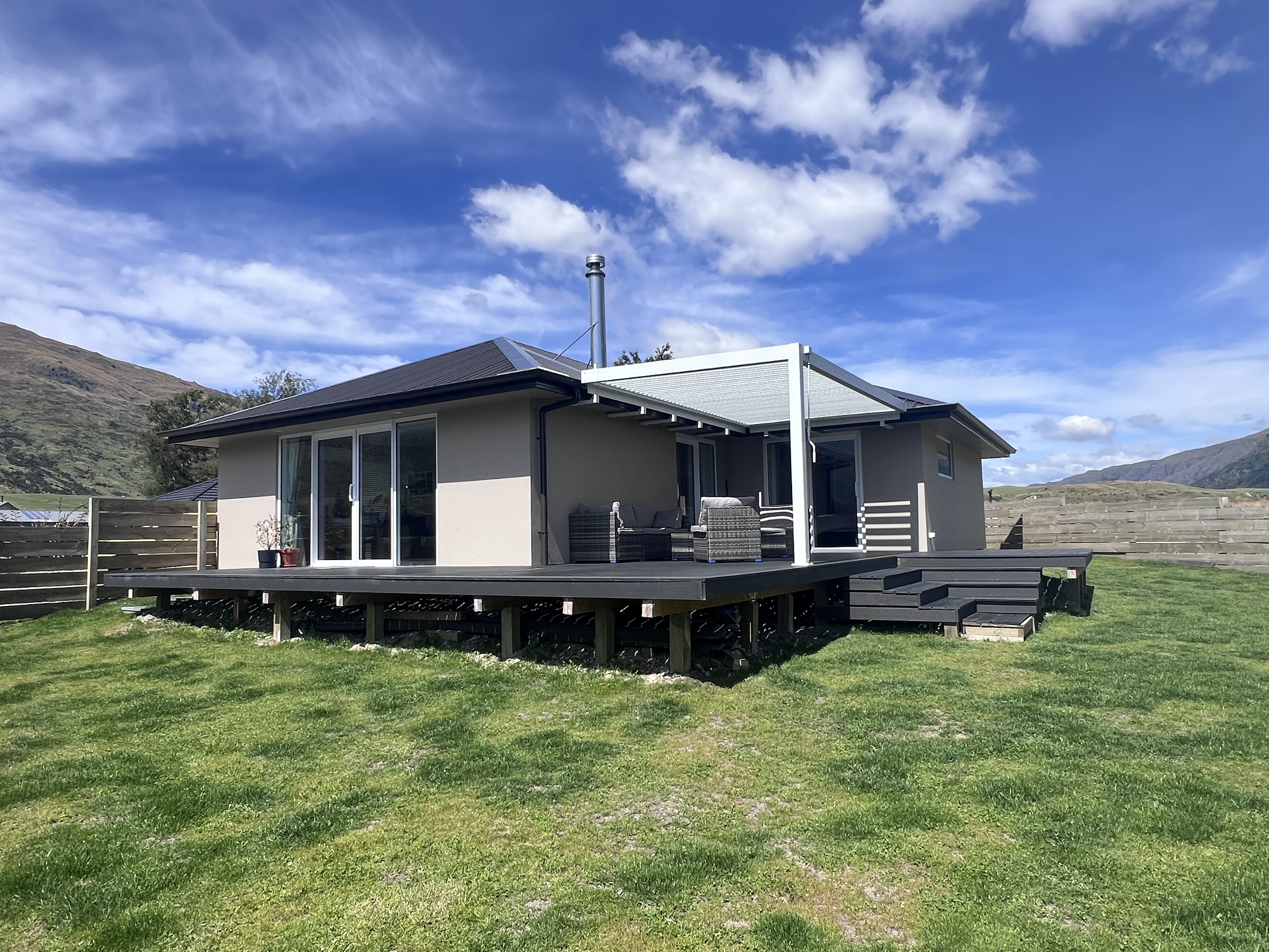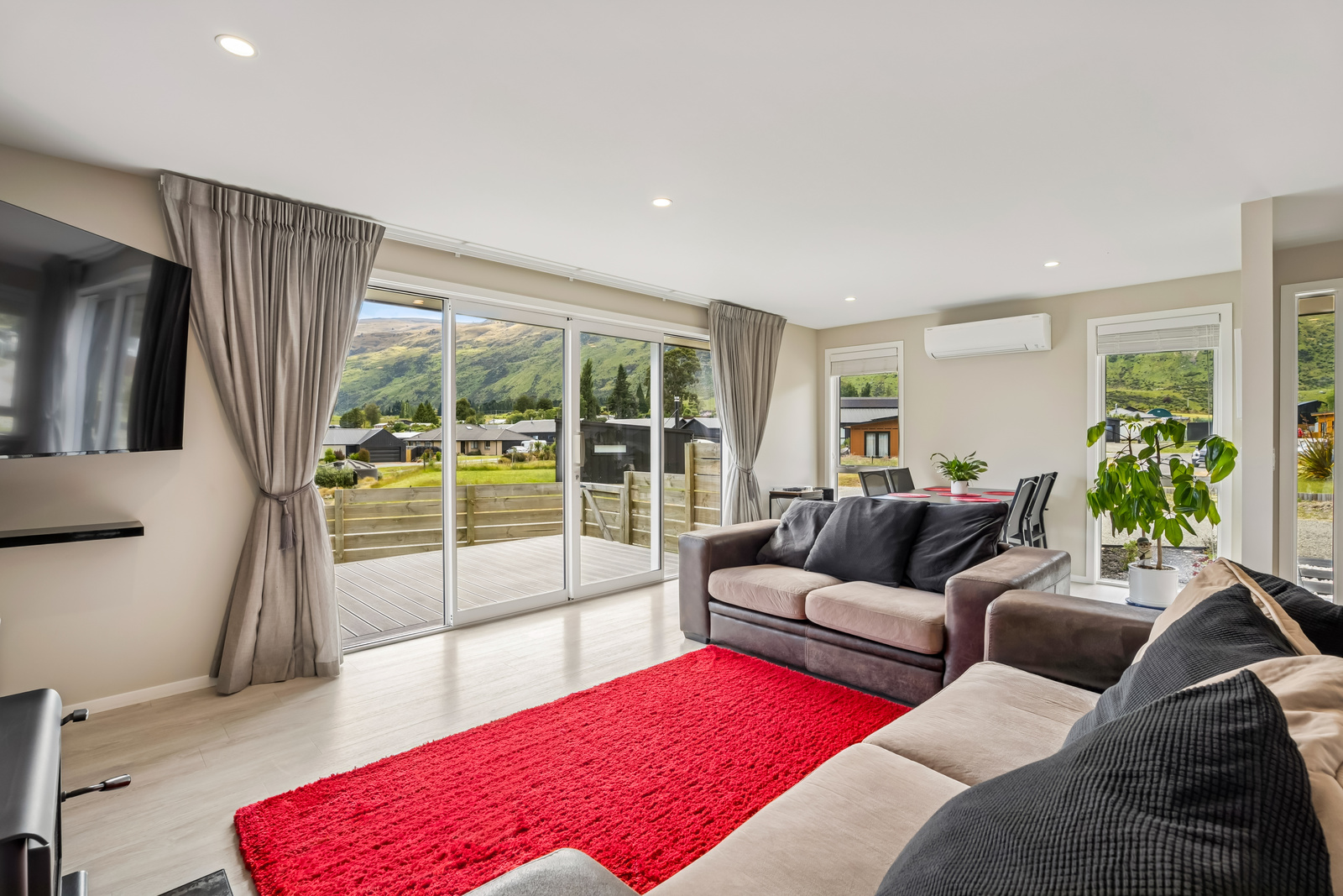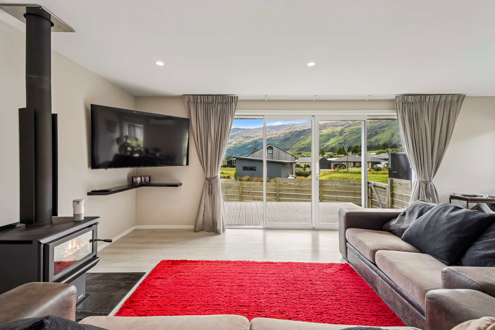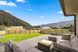 Step inside to an inviting open-plan kitchen and living area that flows seamlessly onto a wraparound deck, capturing stunning mountain views and glimpses of Lake Wakatipu.