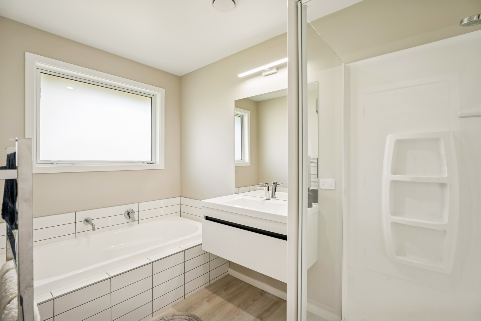 Three additional bedrooms with generous storage, a family bathroom featuring both bath and shower, and a carpeted single garage with laundry access complete this thoughtfully designed home.