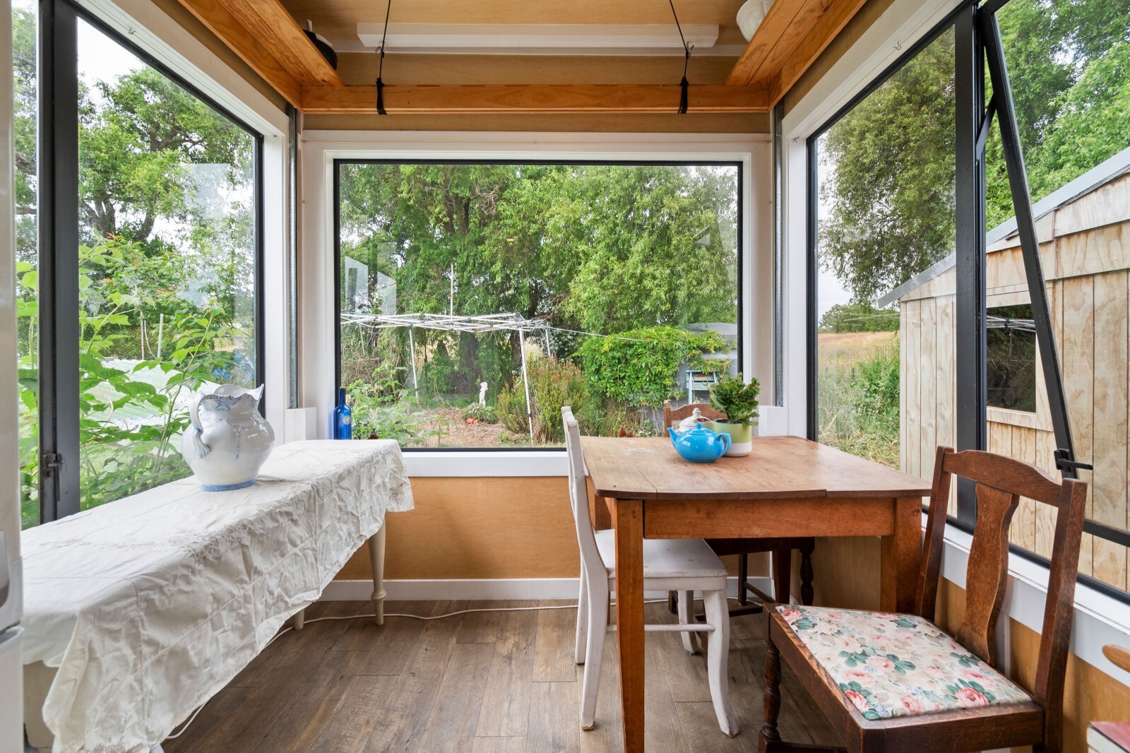 Currently, this property offers the ultimate opportunity to live off the grid in comfort, combining modern sustainability with rustic charm. Three 10 square-meter removable cabins offer comfortable spaces for bedrooms or work areas, plus a charming 14 square-meter tiny house on wheels equipped with a kitchen and bathroom for cozy living. Plus, everything is currently run on solar power stored in reliable batteries, with a backup generator for the winter months.