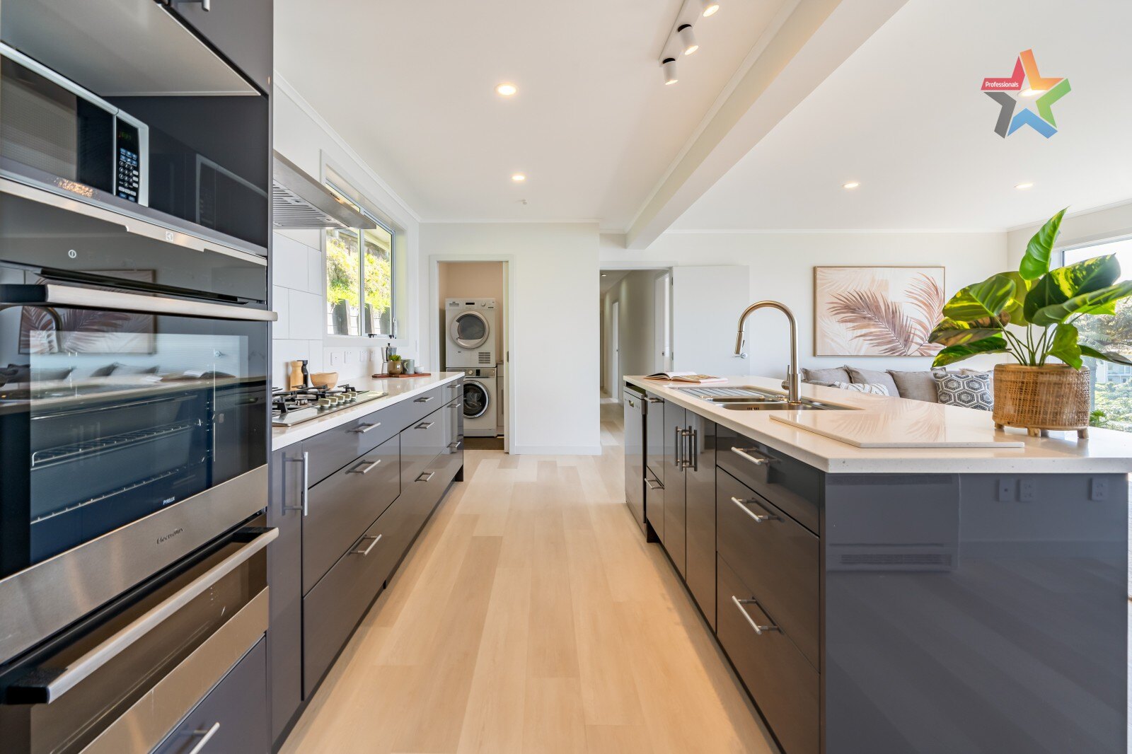 The designer kitchen features Corrian stone tops sweeping across expansive bench space, plenty of storage, gas cooking and unmissable views. The kitchen flows to open-plan living/dining spaces and onto the deck.