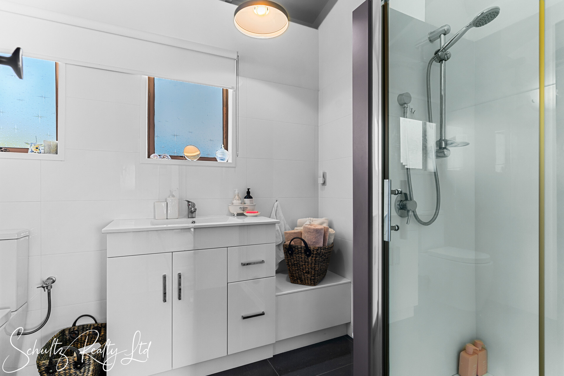 The lower level greets you with a versatile space that can serve as a second living area or an additional bedroom, seamlessly opening out to a peaceful courtyard. Also on this level is a spacious bathroom with a shower-over-bath, vanity, and toilet, along with a generously sized laundry room for added convenience.