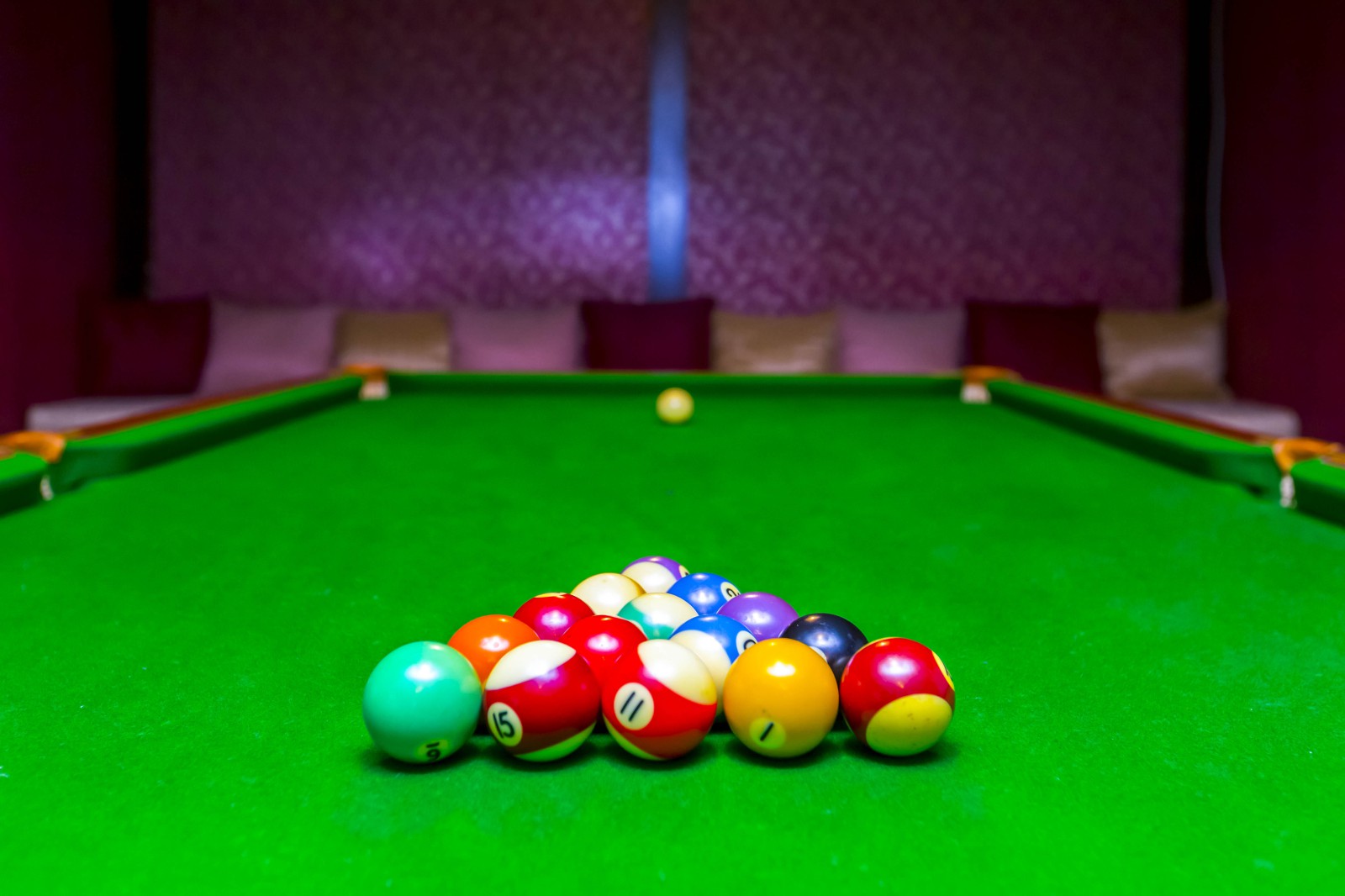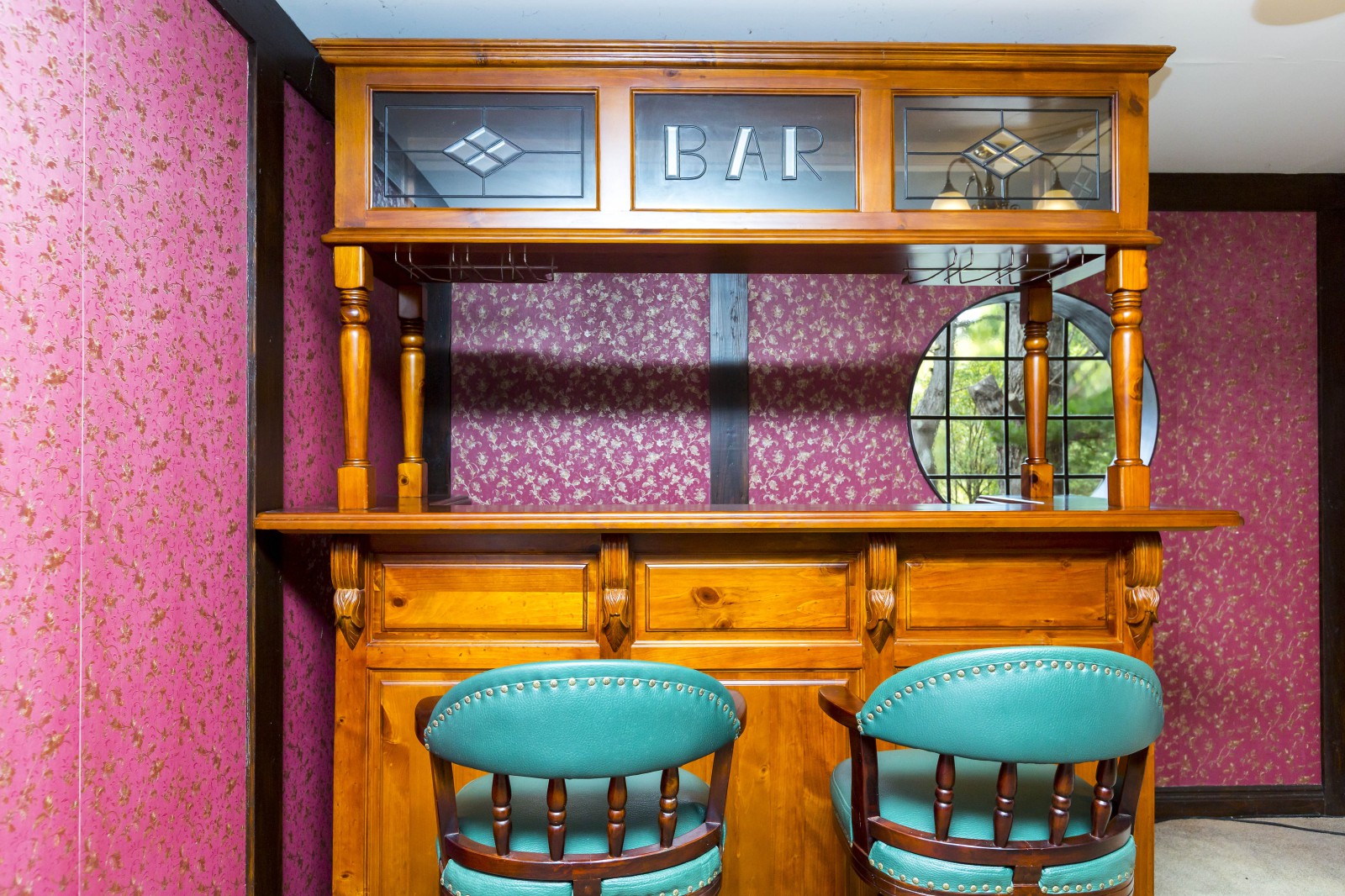 * Billiards room with pool table, bar and bar stools