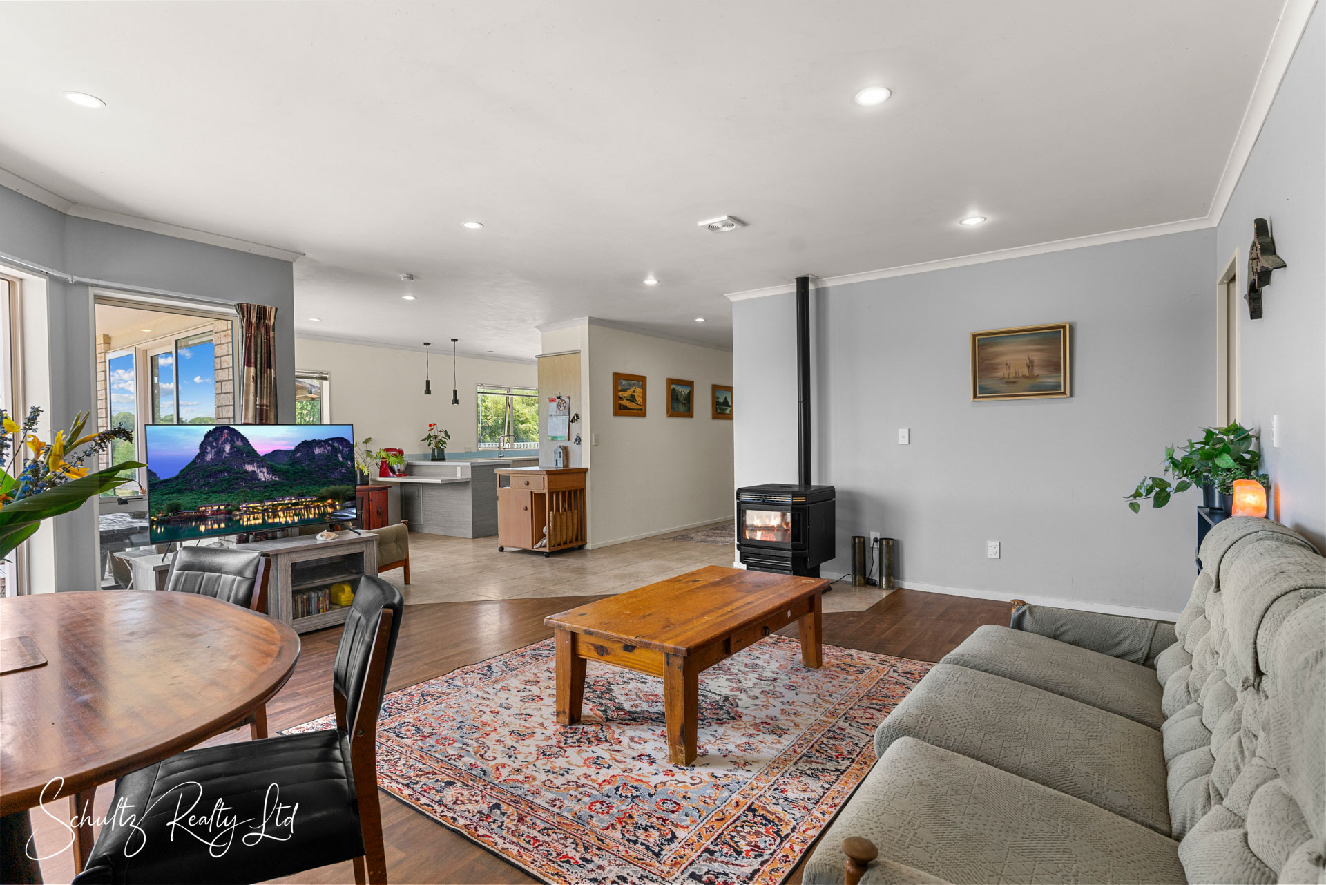 kitchen, dining, and living area is warm and welcoming, featuring a pellet burner with wetback, heat transfer system, and