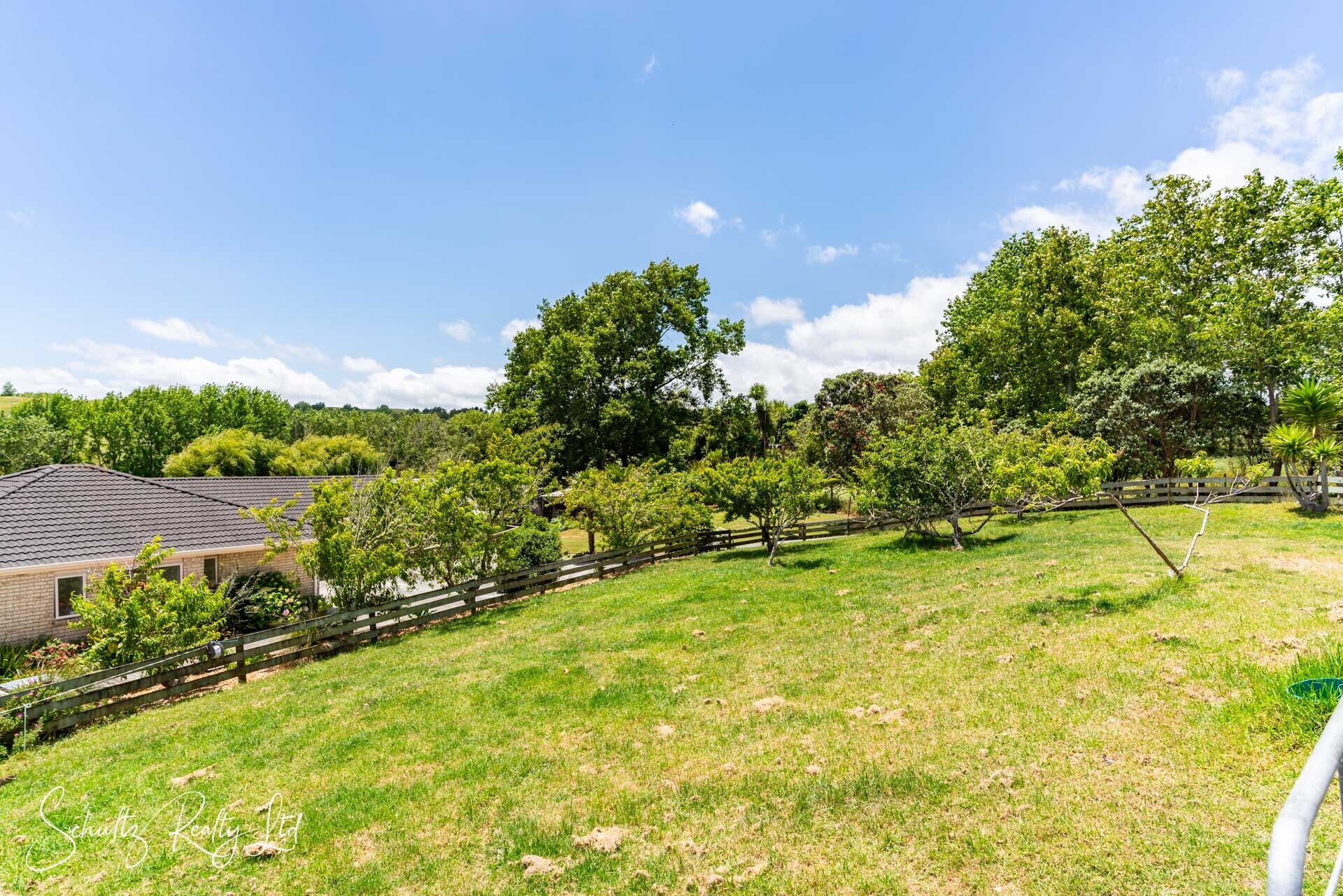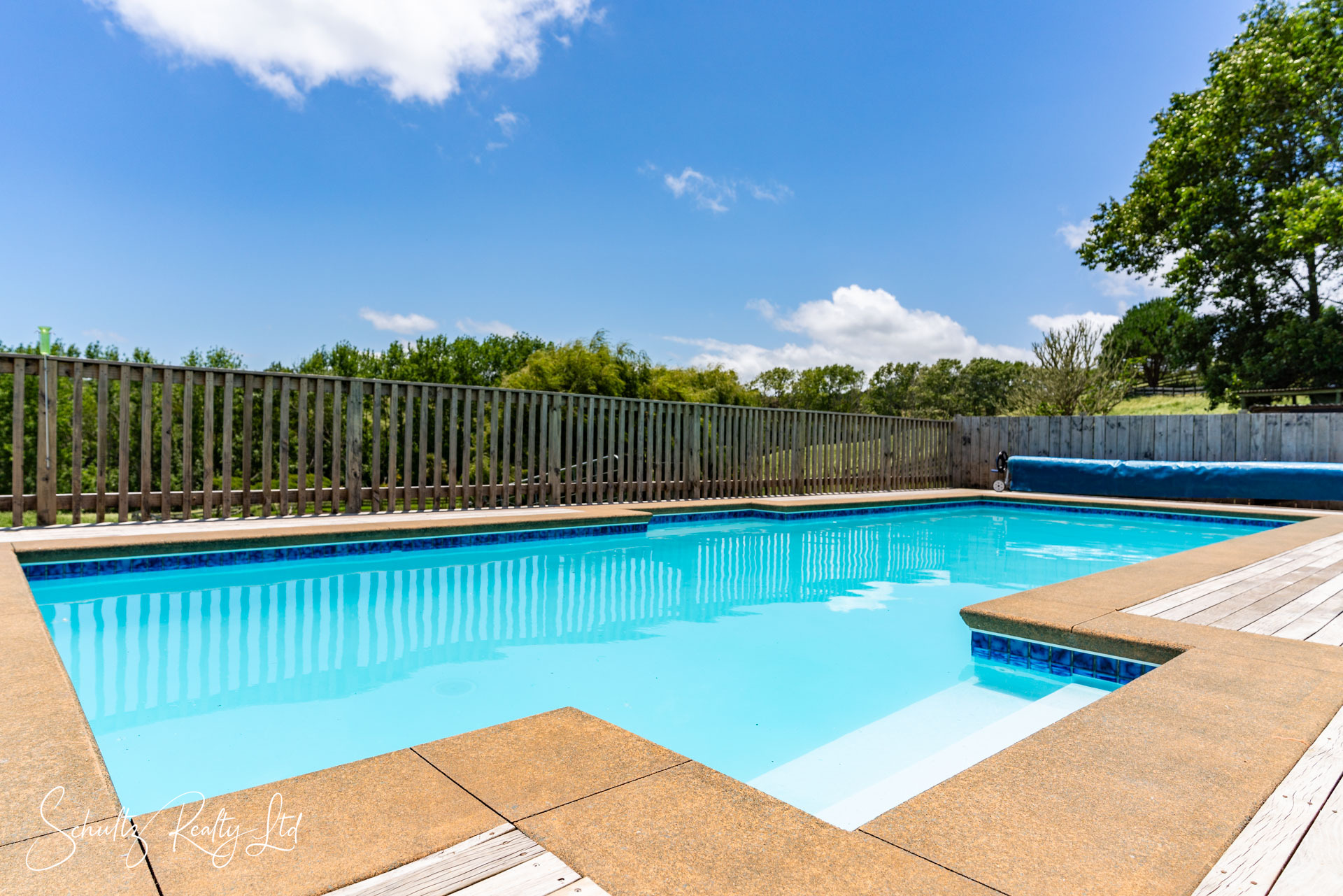 gardens, fruit trees, and lush lawns, all framed by the tranquil countryside. The fully fenced pool area promises summer fun and easy maintenance thanks to its cover.
